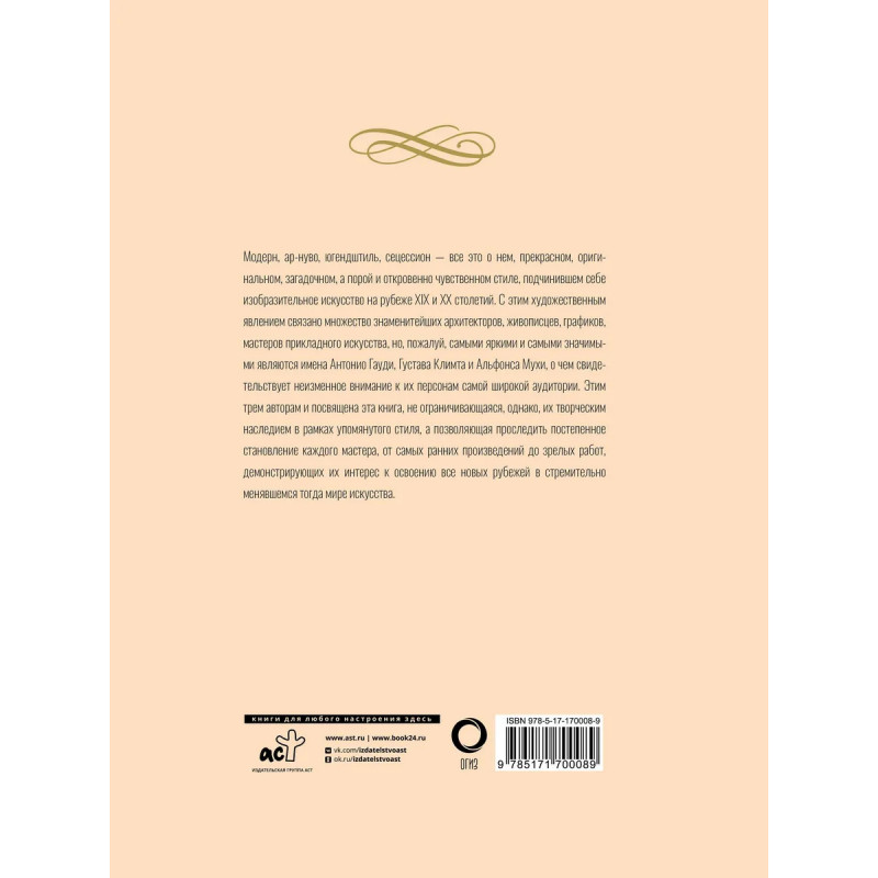 Модерн, ар-нуво, югендштиль, сецессион – все это о нем, прекрасном, оригинальном, загадочном, а порой и откровенно-чувственном стиле, подчинившем себе изобразительное искусство на рубеже XIX и XX столетий. С этим художественным явлением связано множество знаменитейших архитекторов, живописцев, графиков, мастеров прикладного искусства, но, пожалуй, самыми яркими и самыми значимыми являются имена Антонио Гауди, Густава Климта и Альфонса Мухи, о чем свидетельствует неизменное внимание к их персонам самой широкой аудитории. Этим трем авторам и посвящена эта книга, не ограничивающаяся, однако, их творческим наследием в рамках упомянутого стиля, а позволяющая проследить постепенное становление каждого мастера, от самых ранних произведений до зрелых работ, демонстрирующих их интерес к освоению все новых рубежей в стремительно менявшемся тогда мире искусства.