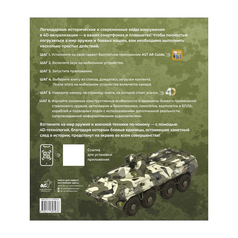 На страницах этой книги рассмотрены легендарные образцы вооружения, сыгравшие важную роль в истории человечества, начиная со времен Великой индустриальной революции середины ХIX века, которая полностью изменила не только облик армий мира, но и сами принципы ведения войны. Разумеется, полностью охватить все разнообразие видов вооружения невозможно, поэтому здесь представлены только те образцы стрелкового оружия и военной техники, которые зарекомендовали себя на полях сражений как самые совершенные и потому пошедшие в массовое производство. Названия многих из них стали символами надежности, безотказности и боевой эффективности: "наган", "мосинка", "максим", "папаша", "кольт", "макаров", "калаш", "катюша", "мессер", "тридцатьчетверка" и многие другие. Здесь представлены все типы вооружений, но самое главное — благодаря использованию технологии дополненной реальности вы получите возможность рассмотреть каждую боевую единицу во всех подробностях в объемном изображении.
