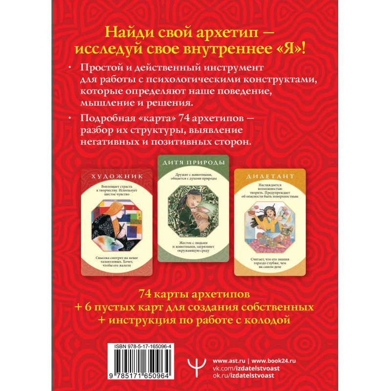 В ваших руках — уникальный набор из 74 карт-архетипов, которые раскрывают темные и светлые стороны души человека. Архетипы — это древние универсальные модели поведения, лежащие в основе коллективного бессознательного, о котором писал Карл Юнг. У каждого человека индивидуальный набор архетипов. Они — наши верные помощники, которые способны выручить даже в самых сложных и нестандартных ситуациях.