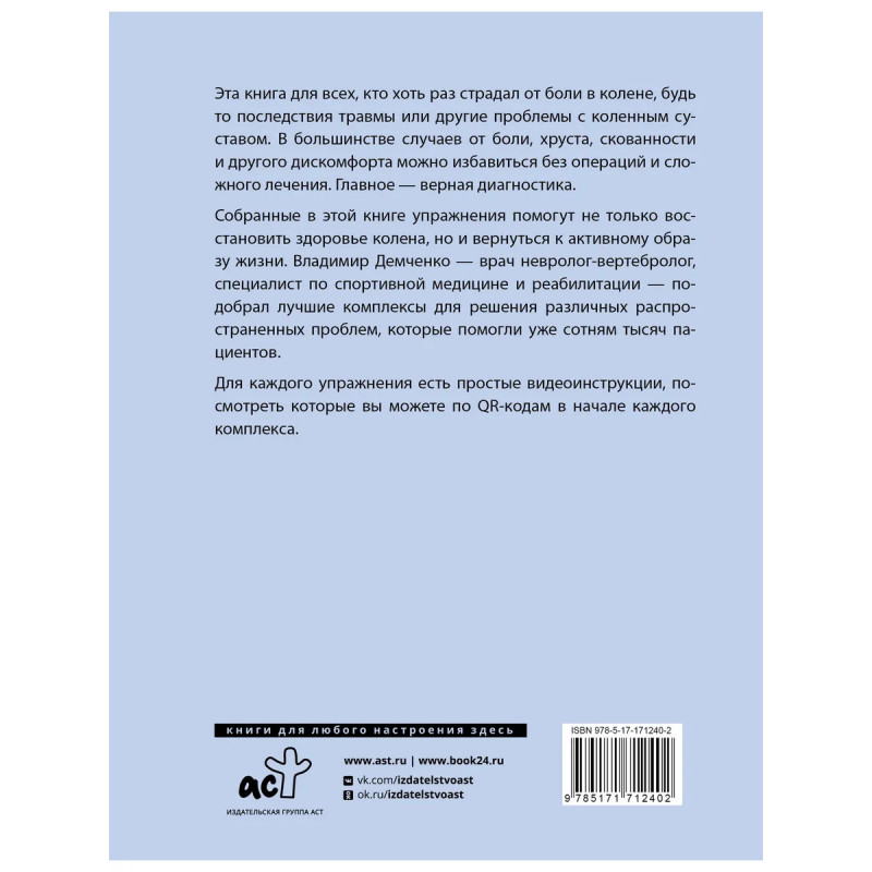 Эта книга для всех, кто хоть раз страдал от боли в колене, будь то последствия травмы или другие проблемы с коленным суставом. В большинстве случаев от боли, хруста, скованности и другого дискомфорта можно избавиться без операций и сложного лечения. Главное — верная диагностика. Собранные в этой книге упражнения помогут не только восстановить здоровье колена, но и вернуться к активному образу жизни. Владимир Демченко — врач невролог-вертебролог, специалист по спортивной медицине и реабилитации — подобрал лучшие комплексы для решения различных распространенных проблем, которые помогли уже сотням тысяч пациентов. Для каждого упражнения есть простые видеоинструкции, посмотреть которые вы можете по QR-кодам в начале каждого комплекса.