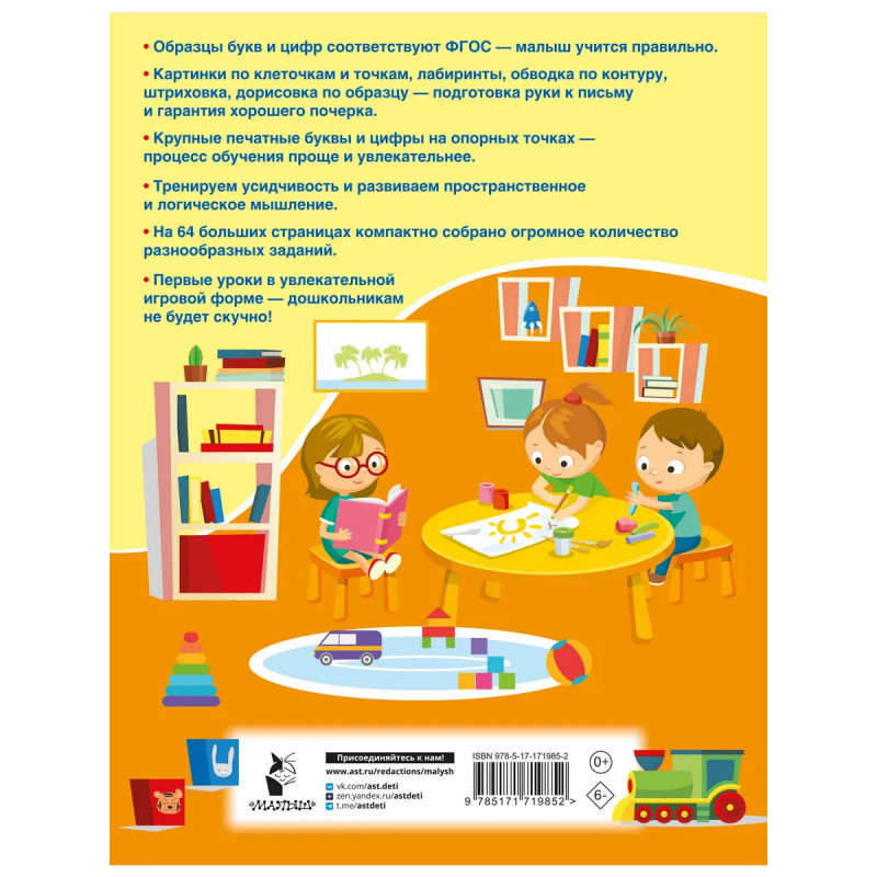 Погрузитесь в мир обучения с нашими увлекательными развивающими пособиями в серии «1000 заданий для детского сада». Созданная с любовью для детей от 5 до 7 лет, эта серия книг сохранит интерес вашего малыша к образованию. Это отличный выбор для родителей, занимательный и увлекательный способ научить дошколят письму, чистописанию, азам математики — одновременно развивая творческие способности и интеллектуальные навыки. • Соответствует ФГОС: разработано с учетом образовательных требований и стандартов. • Всё для развития мелкой моторики, координации движений и навыков письма. • Крупные буквы и цифры — процесс обучения проще и увлекательнее. • Отличное развитие детской инициативы — свободные строки для самостоятельной работы. • С учетом возрастных особенностей детей старшего дошкольного возраста. • На 64 больших страницах компактно собрано огромное количество разнообразных заданий. • Идеальное сочетание цена/качество.