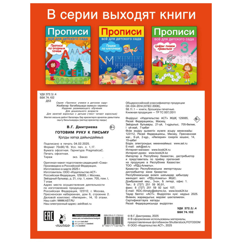 Вашему малышу скоро в школу? Тогда прописи «Готовим руку к письму» — лучший подарок будущему первокласснику! Они превратят учёбу в увлекательную игру. Занимательные задания помогут ребёнку развить пространственное мышление, мелкую моторику и подготовить руку к письму. Прописи разработаны согласно ФГОС и с учётом всех физических и психоэмоциональных особенностей ребёнка. Плотная белая бумага, крупные клетки, цветные иллюстрации, разнообразные игровые задачки, — всё это о нашей книге. Книга будет интересна будущим первоклассникам и их родителям. • Ребёнок подготовит руку к письму. • Малыш научится проводить линии, выполнять штриховку, дорисовывать картинки по образцу, копировать рисунки по клеточкам. • Пособие выстроено по принципу от простого к сложному. • Очаровательные цветные иллюстрации книги и увлекательные задания превращают процесс обучения в занимательное путешествие. • Прописи помогут будущему первокласснику развить пространственное мышление, мелкую моторику и графические навыки.