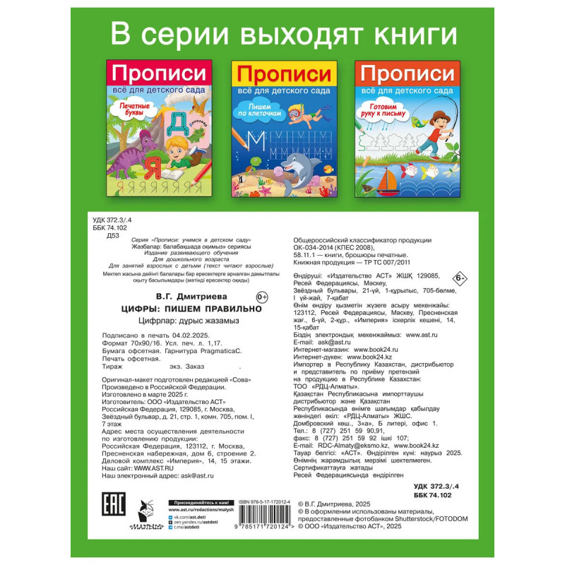 Вашему малышу скоро в школу? Тогда прописи «Цифры: пишем правильно» — лучший подарок будущему первокласснику! Они помогут ребёнку освоить счёт от 1 до 10 и превратят учёбу в увлекательную игру. Прописи разработаны согласно ФГОС и с учётом всех физических и психоэмоциональных особенностей ребёнка. Плотная белая бумага, крупные клетки, цветные иллюстрации, образцы написания каждой цифры и отработка их отдельных элементов, — всё это о нашей книге.