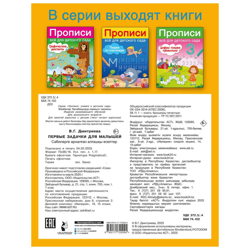 Вашему малышу скоро в школу? Тогда прописи «Первые задачки для малышей» — лучший подарок будущему первокласснику! Они превратят учёбу в увлекательную игру. Занимательные задания помогут ребёнку развить когнитивные навыки и потренироваться в решении первых математических задач. Прописи разработаны согласно ФГОС и с учётом всех физических и психоэмоциональных особенностей ребёнка. Плотная белая бумага, крупные клетки, цветные иллюстрации, разнообразные игровые задачки, — всё это о нашей книге.