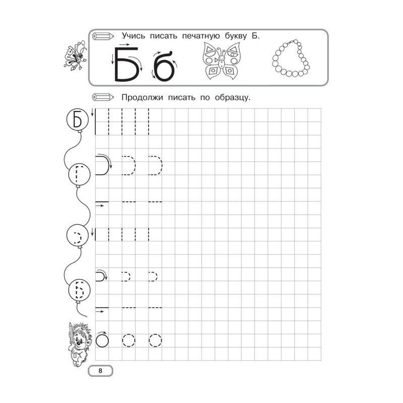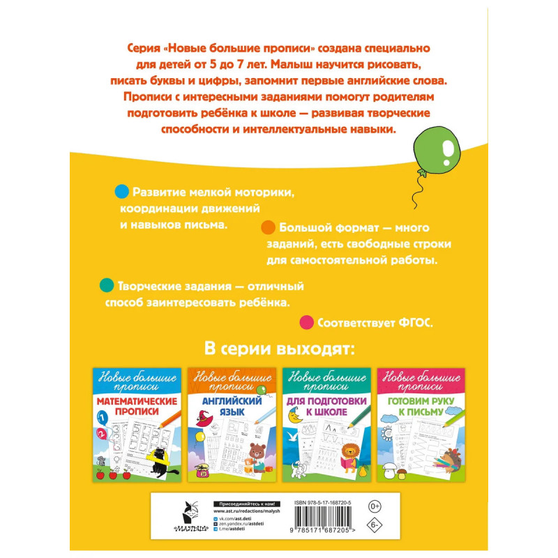 Серия «Новые большие прописи» создана специально для детей от 5 до 7 лет. Малыш научится рисовать, писать буквы и цифры, запомнит первые английские слова. Прописи с интересными заданиями помогут родителям подготовить ребёнка – развивая творческие способности и интеллектуальные навыки. • Развитие мелкой моторики, координации движений и навыков письма. • Комплексная подготовка к школе: графические навыки + письмо + английский. • Крупные печатные буквы — процесс обучения проще и увлекательнее. • Большой формат – много заданий, есть свободные строки для самостоятельной работы. • Творческие задания – отличный способ заинтересовать ребёнка. • Соответствует ФГОС.