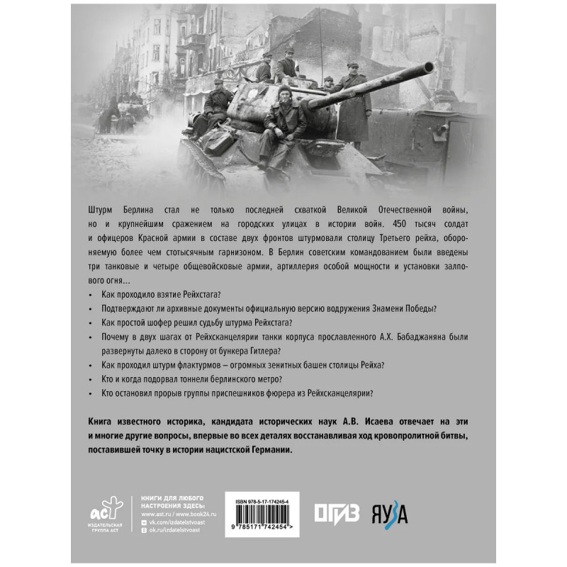 Как проходило взятие Рейхстага? Подтверждают ли архивные документы официальную версию водружения Знамени Победы? Как простой шофер решил судьбу штурма Рейхстага? Почему в двух шагах от Рейхсканцелярии танки корпуса прославленного А.Х. Бабаджаняна были развернуты далеко в сторону от бункера Гитлера? Как проходил штурм флактурмов – огромных зенитных башен столицы Рейха? Кто и когда подорвал тоннели берлинского метро? Кто остановил прорыв группы приспешников фюрера из Рейхсканцелярии? Книга известного историка, кандидата исторических наук А.В. Исаева отвечает на эти и многие другие вопросы.