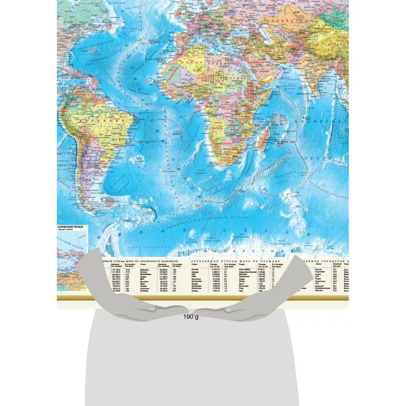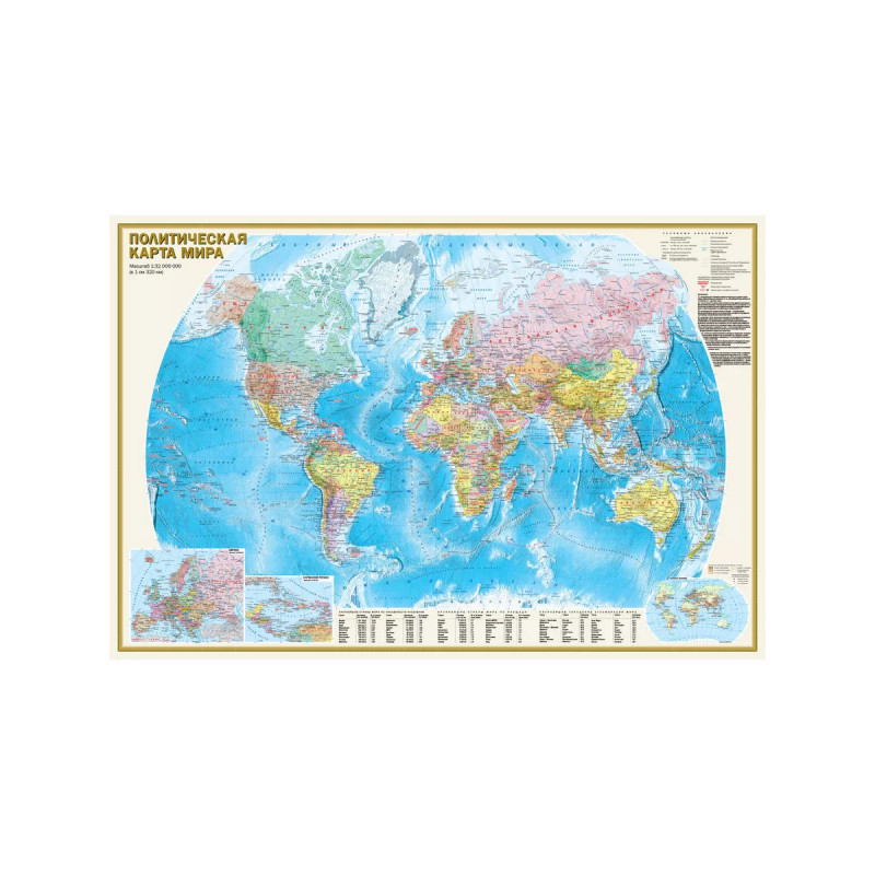 Карта формата А имеет размеры 117х79 мм. На одной стороне листа - Политическая карта мира масштаба 1:32 (в 1 см 32 км). На карте представлены все независимые государства мира, а также зависимые территории и территории с особым статусом. Пунсонами показаны населённые пункты с градациями "более 1 млн жителей", "от 1 тыс. до 1 млн жителей" и "менее 1 тыс. жителей". Основную карту дополняет врезка в более крупном масштабе на Европу. На другой стороне листа карта "Федеративное устройство России" в масштабе 1:7 . На карте представлены 89 субъектов Федерации, включая Республику Крым и Севастополь, Донецкую и Луганскую народные республики, Запорожскую и Херсонскую области, с их столицами и центрами. Субъекты РФ сгруппированы по 8 федеральным округам. Численность населения городов и посёлков дана по 6 градациям. Показаны магистральные пути железнодорожного и автомобильного сообщения. Карта упакована в прозрачный тубус (пакет из мягкого пластикас еврослотом). Размеры упаковки: длина 8 мм, диаметр 5 мм.