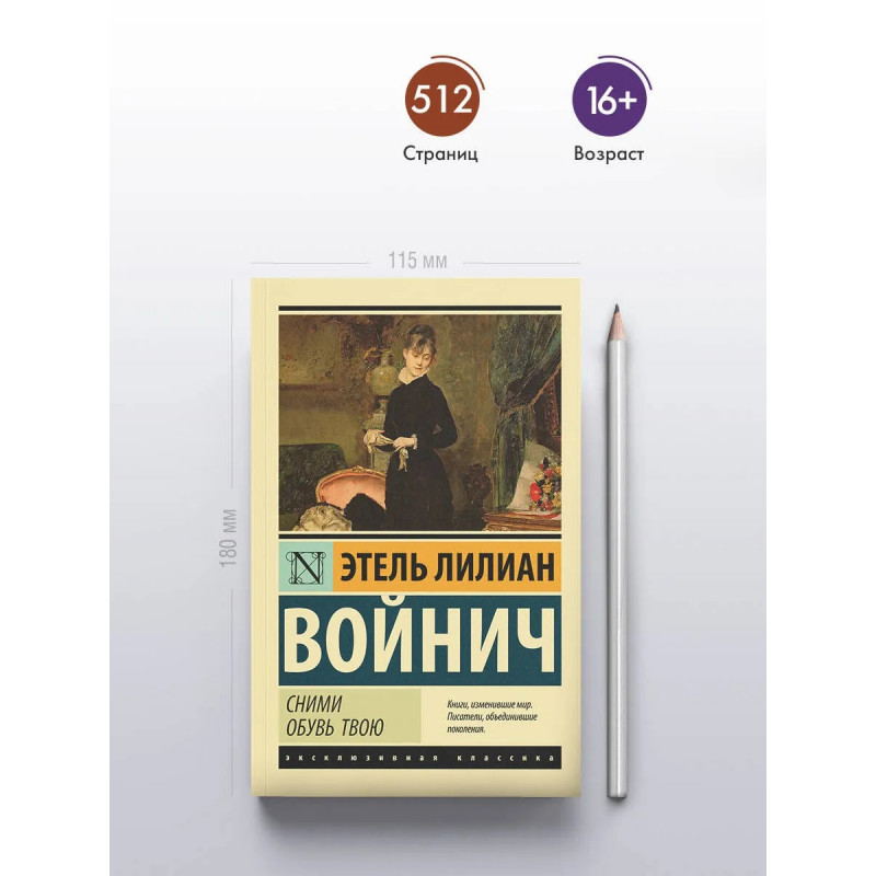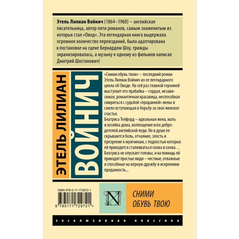 — Этель Лилиан Войнич — английская писательница первой половины XX века, прежде всего известная по трилогии об Оводе. — «Овод», первый роман трилогии, был забыт вскоре после публикации, но обрел вторую жизнь в середине столетия и превратился в международный бестселлер. — «Сними обувь твою» — третья и заключительная книга трилогии, но хронологически она предшествует двум другим, а главной героиней становится прабабка Овода — гордая, независимая, романтичная красавица, неспособная смириться с судьбой «проданной» жены. — Издание в серии «Эксклюзивная классика» — в удобном карманном формате и узнаваемом оформлении.