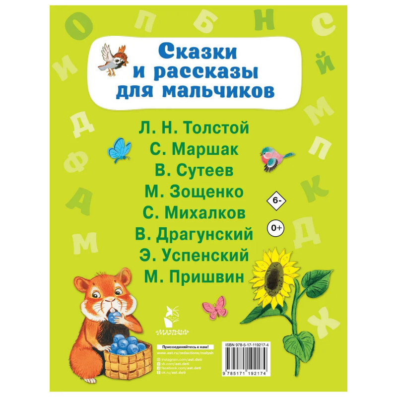 "Учусь читать слог за слогом" новая серия "Малыша", которая поможет вашим детям научиться читать самостоятельно. В книге большие буквы, которые очень легко прочитать, и все слова разбиты на слоги с ударениями. В книгу "Сказки и рассказы для мальчиков" вошли самые лучшие произведения С. Маршака, В. Сутеева, С. Михалкова, Э. Успенского и других знаменитых авторов, которые и сами были в детстве такие же, как и их герои весёлые, любознательные, озорные, непослушные и храбрые мальчишки! Для дошкольного возраста.