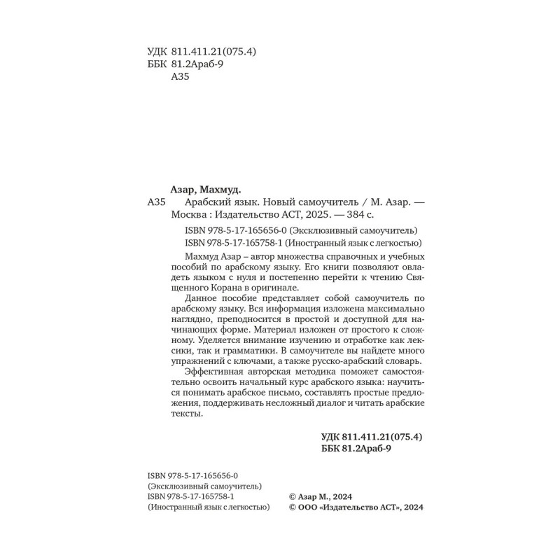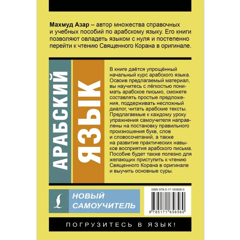 Махмуд Азар автор множества справочных и учебных пособий по арабскому языку. Его книги позволяют овладеть языком с нуля и постепенно перейти к чтению Священного Корана в оригинале. Данное пособие представляет собой самоучитель по арабскому языку. Вся информация изложена максимально наглядно, преподносится в простой и доступной для начинающих форме. Материал изложен от простого к сложному. Уделяется внимание изучению и отработке как лексики, так и грамматики. В самоучителе вы найдете много упражнений с ключами, а также русско-арабский словарь. Эффективная авторская методика поможет самостоятельно освоить начальный курс арабского языка: научиться понимать арабское письмо, составлять простые предложения, поддерживать несложный диалог и читать арабские тексты.