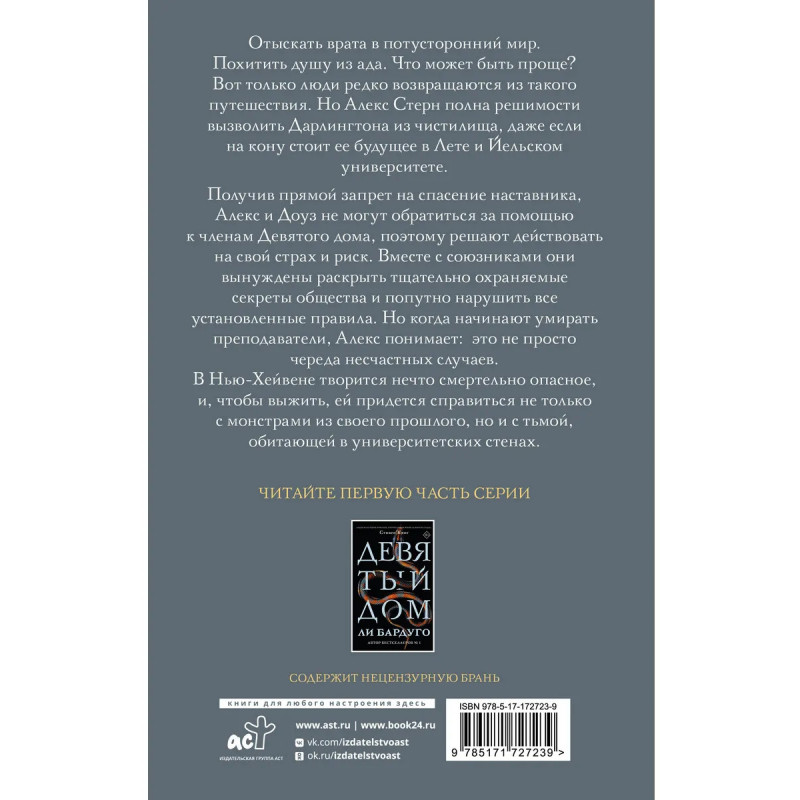 – Бестселлер New York Times: долгожданная новинка от писательницы Ли Бардуго, автора популярных циклов «Тень и кость», «Шестёрка воронов» и «Девятый дом». – Продолжение романа «Девятый дом» об изучении черной магии в стенах Йельского университета. В России было продано более 40 000 экземпляров! – Книги Бардуго переведены на 38 языков и изданы в более чем 50 странах. «Тень и кость» экранизировал Netflix, а на экранизацию «Девятого дома» уже приобретены права Amazon Studios. – Захватывающий триллер понравится любителям жанра dark fantasy, мистики и «темной академии». Главная героиня книги — студентка Алекс Стерн с неблагополучным прошлым и способностью видеть призраков.