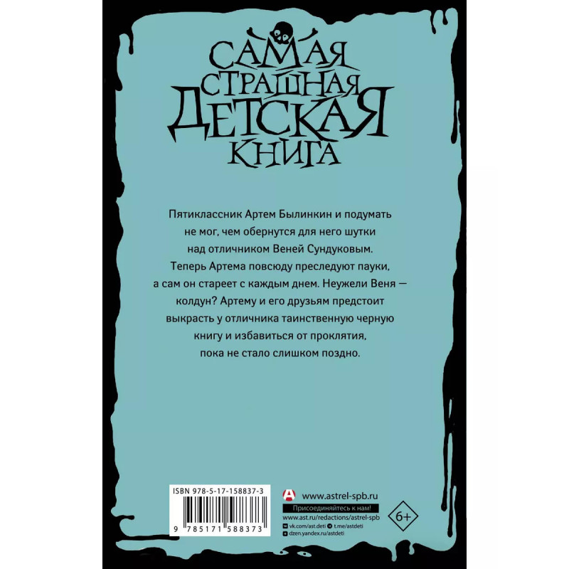 Черная книга из 5 "А". В школе и так хватает проблем - тяжелые уроки, множество домашних заданий, непростые отношения с одноклассниками. Но что, если отличник из твоего класса оказался колдуном и проклял тебя? Артем Былинкин не понаслышке знаком с такой ситуацией. Теперь ему и его друзьям предстоит найти черную книгу и избавиться от проклятия, пока не стало слишком поздно.