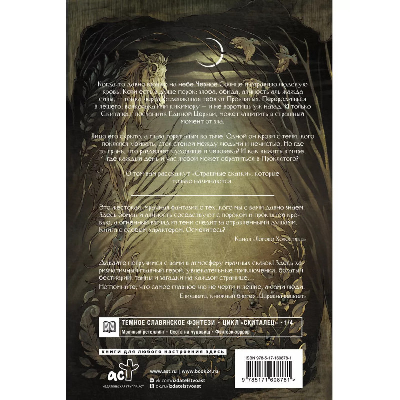Скиталец. Страшные сказки. Много-много лет назад взошло Черное Солнце и отравило человечью кровь. Коли держишь в душе зависть, злобу, обиду, непременно переродишься в Проклятого: кикимору али волколака. Лишь Скиталец, посланник Единой Церкви, в силах защитить тебя от напасти. Лицо его скрыто, глаза горят в темноте углями. Он той же крови, что и те, кого поклялся убивать, стеной стоя между нечистью и людом. Но где граница, что разделяет монстра и человека? И удастся ли уцелеть в мире, где каждый день и каждый час любой может обернуться Проклятым?