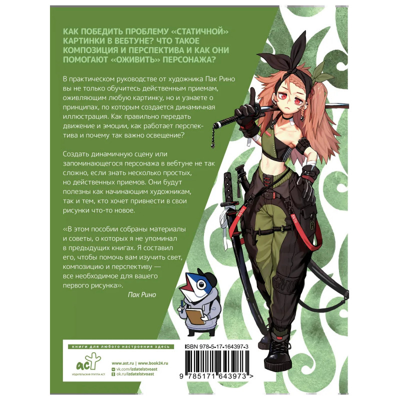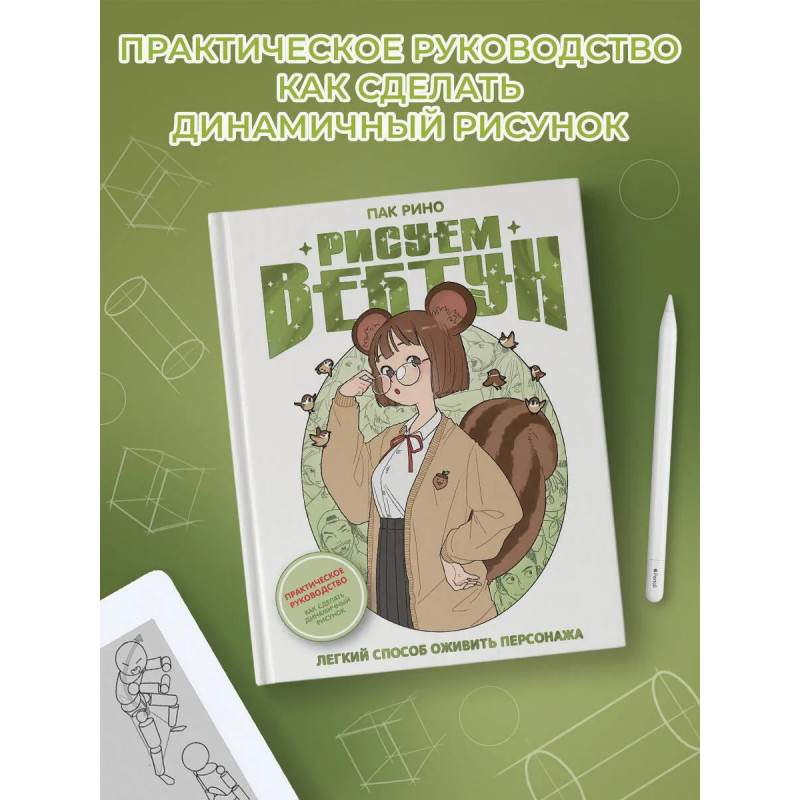 - Третья книга серии «Рисуем вебтун» от корейского мастера диджитал-арта Пака Рино! - Практическое руководство по рисованию как для начинающих, так и для опытных художников. Основы (перспектива, построение) и советы по созданию динамичных рисунков. - Большой формат позволяет детально изучить схемы и иллюстрации, объясняющие материал. Мелованная бумага помогает сохранить яркость изображений, а твердый переплет и стильное оформление делают книгу отличным подарком. - Пособие входит в список лучших руководств по графическому рисунку от Amazon. Книги автора популярны не только в Корее, но и в Японии. - Пак Рино известен созданием оригинальных дизайнов персонажей на базе простых вещей (наиболее известны его «девушка-сова» и «парень-шаурма»). Его творчество отличают мастерство работы с оттенками и формами, яркий стиль и ловкость переключения между стилизациями.