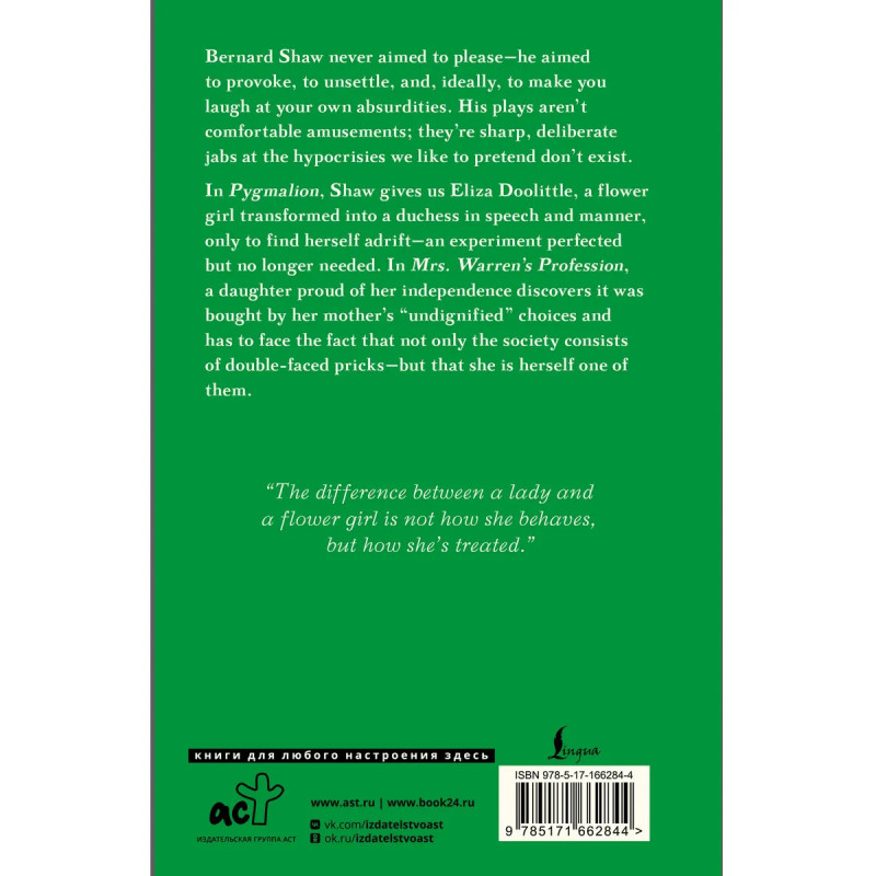 В пьесе Бернарда Шоу "Пигмалион" профессор Хиггинс превращает цветочницу Элизу в леди, но вместо благодарной и покорной Галатеи сталкивается нос к носу с разгневанной и знающей себе цену девушкой, потерявшей место в жизни. А в "Профессии миссис Уоррен" Виви, гордящаяся своей независимостью, вынуждена не только признать, что ее свобода оплачена "недостойным" выбором ее матери, но и увидеть в ханжестве окружающих собственное отражение. Как все лучшие комедии в истории литературы, пьесы Бернарда Шоу — это зеркала, в которых каждый видит себя. Они известны своей язвительностью и остроумием, за которыми неуютная правда даже и не пытается скрыться — вот она, прямо перед вами, и это вы скрываетесь от нее, прищуривая глаза от хохота. Готовы раскрыть их шире? Тексты комедий публикуются на английском языке без адаптации и сокращений.