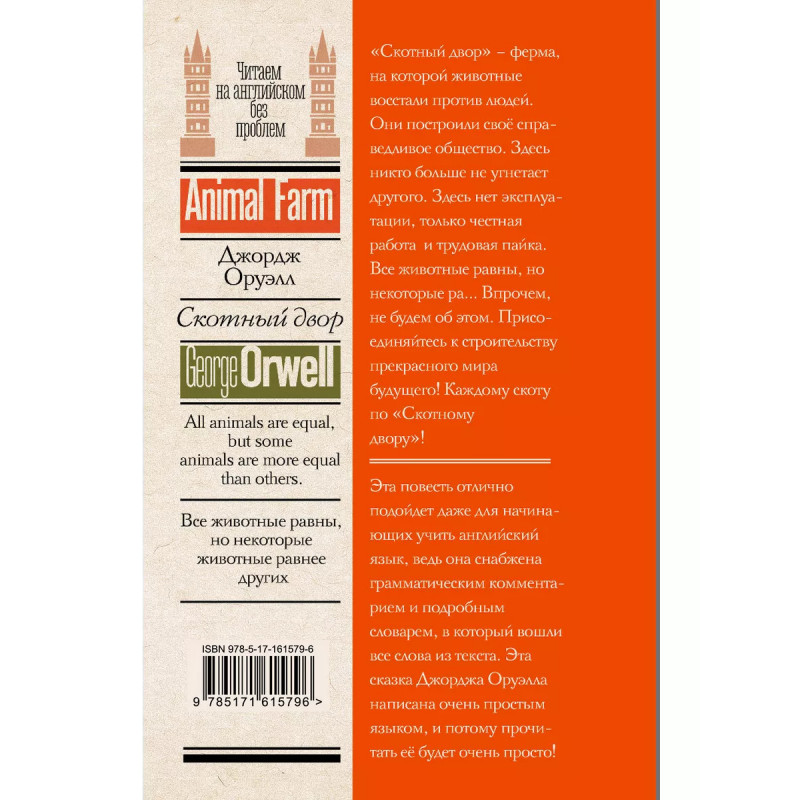Скотный двор. "Скотный двор" - ферма, на которой животные восстали против людей. Они построили своё справедливое общество. Здесь никто больше не угнетает другого. Здесь нет эксплуатации, только честная работа и трудовая пайка. Все животные равны, но некоторые ра Впрочем, не будем об этом. Присоединяйтесь к строительству прекрасного мира будущего! Каждому скоту по "Скотному двору"! Эта повесть отлично подойдет даже для начинающих учить английский язык, ведь она снабжена грамматическим комментарием и подробным словарем, в который вошли все слова из текста. Адаптация составлена С. А. Матвеевым, опытным автором множества популярных учебников английского. Эта сказка Джорджа Оруэлла написана очень простым языком, и потому прочитать её будет очень просто!
