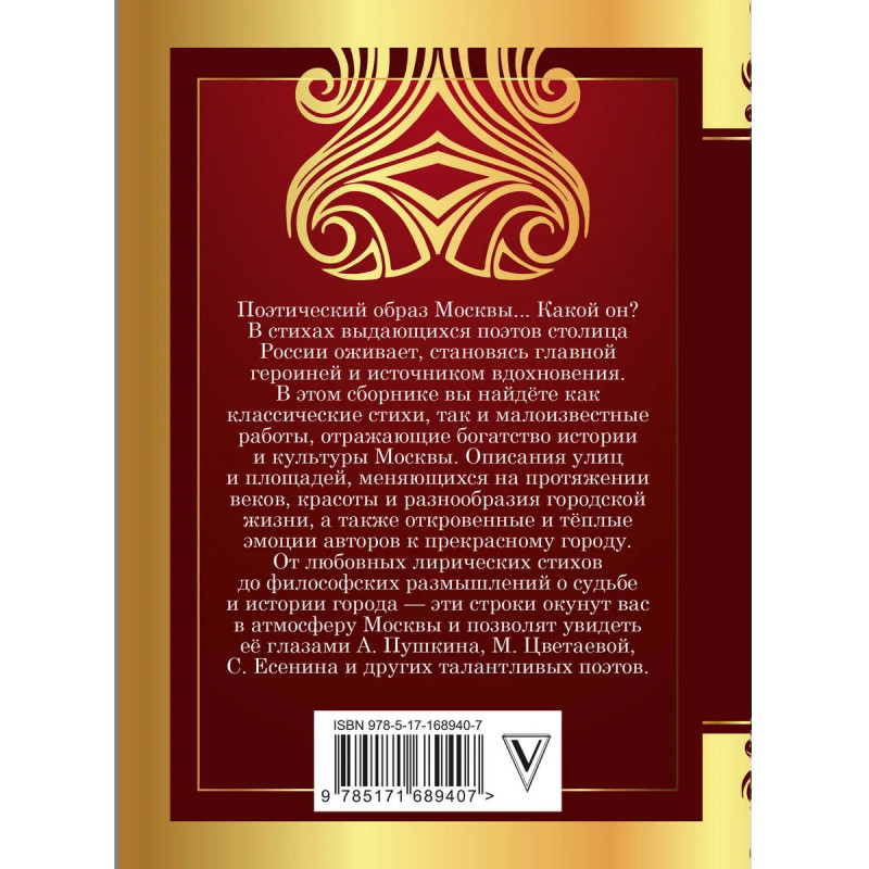 Поэтический образ Москвы... Какой он? В стихах выдающихся поэтов столица оживает, становясь главной героиней и источником вдохновения. В этом сборнике вы найдёте как классические стихи, так и малоизвестные работы, отражающие богатство истории и культуры Москвы. Описания улиц и площадей, меняющихся на протяжении веков, красоты и разнообразия городской жизни, а также откровенные и тёплые эмоции авторов к прекрасному городу. От лирических стихов до философских размышлений о судьбе и истории сердца России — эти строки окунут вас в атмосферу Москвы и позволят увидеть её глазами А. Пушкина, М. Цветаевой, С. Есенина и других талантливых поэтов.