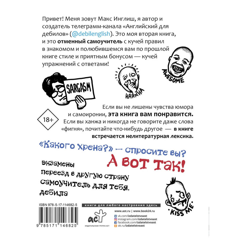 Привет! Меня зовут Макс Инглиш, я автор и создатель канала «Английский для дебилов» (debilenglish). Это моя вторая книга, и это отменный самоучитель с кучей правил в знакомом и полюбившемся вам по прошлой книге стиле и приятным бонусом — кучей упражнений с ответами! Если вы не лишены чувства юмора и самоиронии, эта книга вам понравится. Если вы ханжа и никогда не говорите даже слова «фигня», почитайте что-нибудь другое — в книге встречается нелитературная лексика. «Какого хрена?» — спросите вы? А вот так! 18+ экзамены переезд в другую страну самоучитель для тебя, дебила