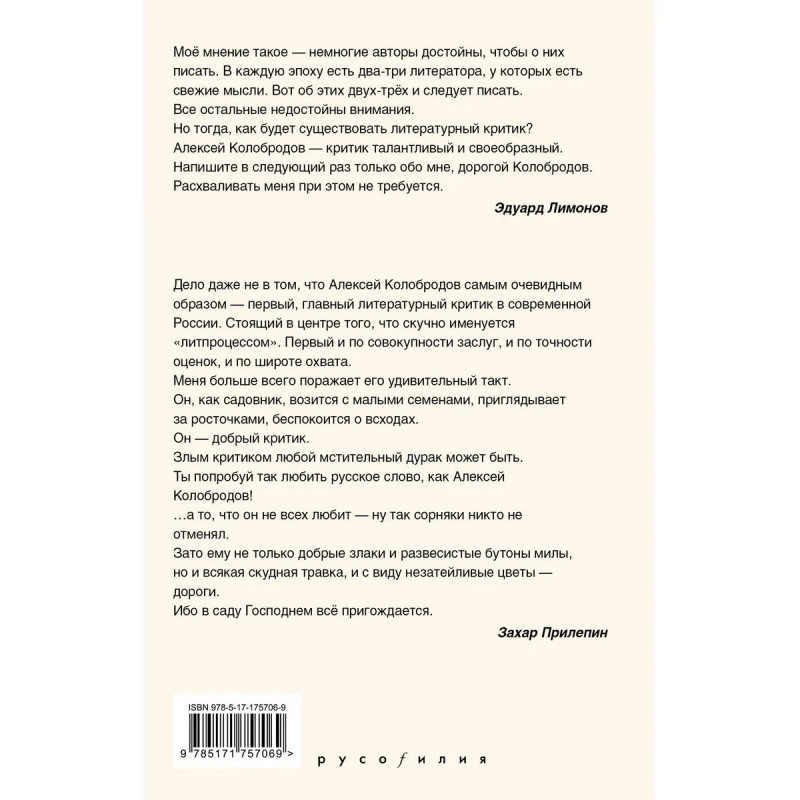 - Сборник эссе одного из главных критиков современной России, автора с ярким стилем и оригинальной оптикой. - В издание, приуроченное к 55-летию автора, вошли «размышления о стране и литературе». Среди героев повествования — Егор Летов и Михаил Шуфутинский, Гузель Яхина и Михаил Елизаров, Виктор и Александр Пелевины, Юрий Бондарев и Юрий Трифонов… - «Алексей Колобродов — добрый критик. Злым критиком любой мстительный дурак может быть. …А то, что он не всех любит — ну так сорняки никто не отменял. Зато ему не только добрые злаки и развесистые бутоны милы, но и всякая скудная травка, и с виду незатейливые цветы — дороги» — Захар Прилепин. - Редакция «КПД», серия «Русофилия».