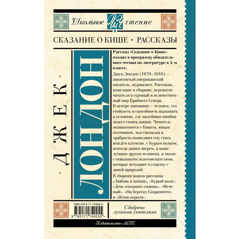 Рассказ "Сказание о Кише" входит в программу обязательного чтения по литературе в 5-м классе. Джек Лондон (1879 – 1916) — знаменитый американский писатель, журналист. Рассказы, вошедшие в сборник, переносят читателя в суровый и величественный мир Крайнего Севера. В центре внимания – человек, его стойкость и способность выживать в условиях, где малейшая ошибка может стоить жизни. Читатель познакомится с Кишем, юным охотником, чья смекалка и храбрость позволяют ему стать вождём племени, с Бурым волком, некогда диким зверем, а ныне – лучшим другом человека, а также с отважными золотоискателями, которые вступают в схватку с дикой природой. В сборник вошли рассказы "Любовь к жизни", "Бурый волк", "Дочь северного сияния", "Меченый", "На берегах Сакраменто" и "Жена короля".