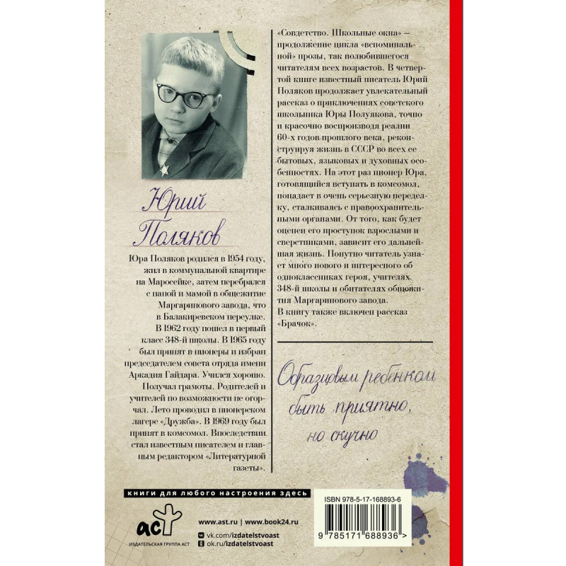 - Четвертая книга цикла бестселлеров о советском детстве. - На этот раз рассказчику — Юрию Полуякову — уже 13 лет. И основное его внимание обращено на школьные проказы, порой балансирующие на грани криминала. - Цикл «Совдетство» в деталях и с теплотой воссоздает атмосферу детства в СССР конца 1960-х годов. Читатель смотрит на мир глазами мальчишки, живущего в Москве того времени. Романы затрагивают темы учебы, дворовых игр, отношений с родителями и, конечно, первой любви. - Серия «Новая проза Юрия Полякова».