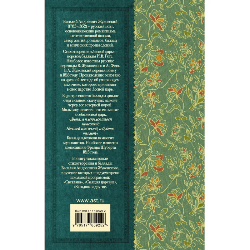 Лесной царь. Сказки и баллады. Василий Андреевич Жуковский (1783-1852) - русский поэт, основоположник романтизма в отечественной поэзии, автор элегий, романсов, баллад и эпических произведений. Стихотворение "Лесной царь" - перевод баллады И.В. Гёте. Наиболее известны русские переводы В. Жуковского и А. Фета. В.А. Жуковский перевел поэму в 1818 году. Произведение основано на древней легенде об умирающем мальчике, которого призывает в свое царство Лесной царь. В центре сюжета баллады диалог отца с сыном, скачущих на коне через лес вечерней порой. Мальчику кажется, что его манит к себе лесной царь: "Дитя, я пленился твоей красотой: Неволей иль волей, а будешь ты мой". Баллада вдохновила многих музыкантов. Наиболее известна композиция Франца Шуберта 1815 года. В книгу также вошли стихотворения и баллады Василия Андреевича Жуковского, изучение которых предусмотрено школьной программой: "Светлана", "Спящая царевна", "Загадка" и другие.