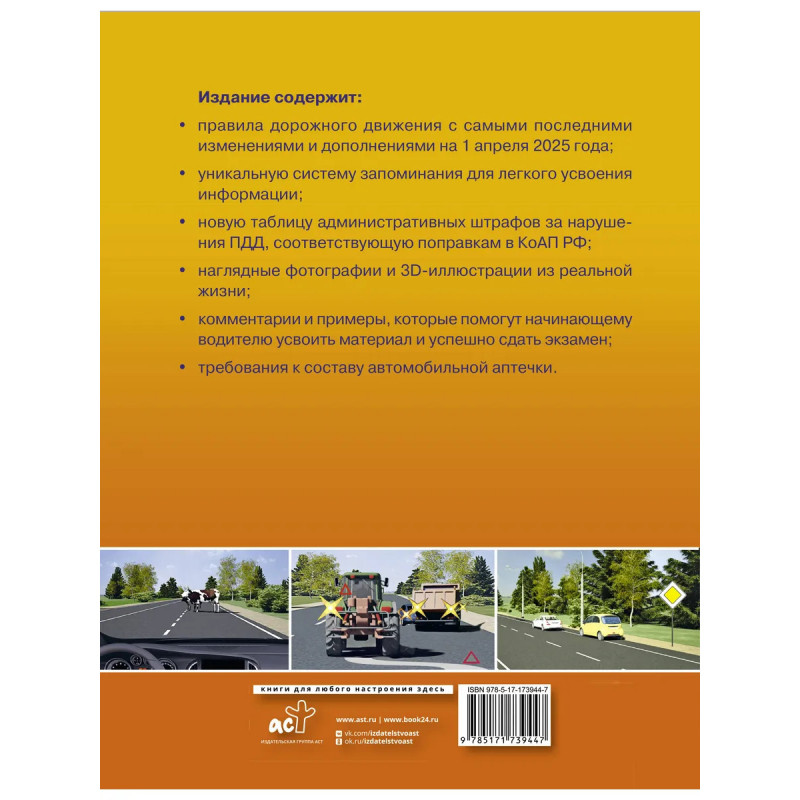 Издание содержит: — правила дорожного движения с самыми последними изменениями и дополнениями на 1 апреля 2025 года; — уникальную систему запоминания для легкого усвоения информации; — новую таблицу административных штрафов за нарушения ПДД, соответствующую поправкам в КоАП РФ; — наглядные фотографии и 3D-иллюстрации из реальной жизни; — комментарии и примеры, которые помогут начинающему водителю усвоить материал и успешно сдать экзамен; — перечень неисправностей и условий, при которых запрещается эксплуатация транспортных средств; — требования к составу автомобильной аптечки. Издание учитывает все изменения, опубликованные в официальных источниках на момент подписания издания в печать.