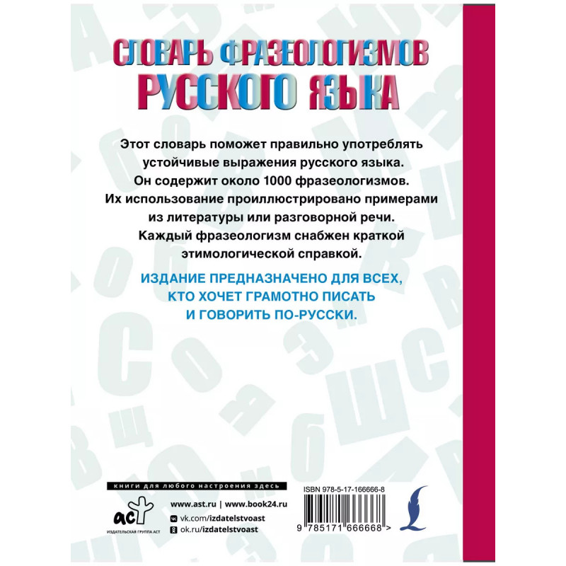 Фразеологизмы это исторически связанные единицы языка; готовые сочетания слов, которые употребляются в неизменном виде в тех или иных ситуациях. Данный словарь содержит около 1000 фразеологизмов. Их использование проиллюстрировано примерами из литературы или разговорной речи. Каждый фразеологизм снабжен краткой этимологической справкой. Издание предназначено для всех, кто хочет грамотно писать и говорить по-русски.