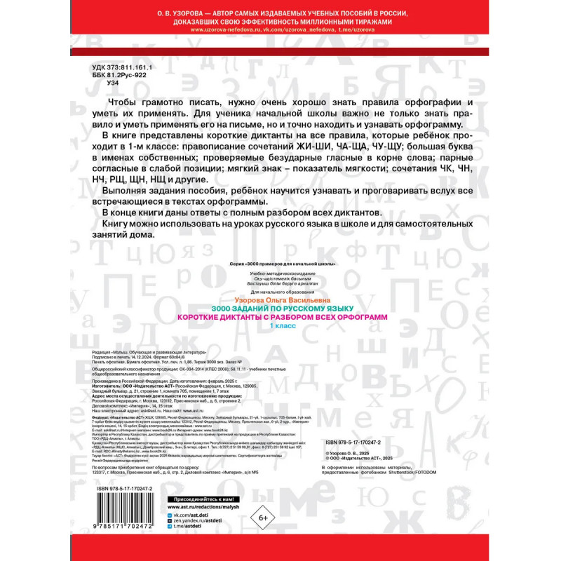 Для ученика начальной школы важно не только знать правило и уметь применять его на письме, но и точно находить и узнавать орфограмму. В книге представлены короткие диктанты на все правила, которые ребёнок проходит в 1 классе. Такие диктанты удобно использовать для быстрой проверки знаний, повторения, эффективного тренинга на каждом уроке. Выполняя задания пособия, ребёнок научится узнавать и проговаривать вслух все встречающиеся в текстах орфограммы, благодаря чему сможет писать диктанты без ошибок. В конце книги даны ответы с полным разбором всех диктантов. Книгу можно использовать на уроках русского языка в школе и для самостоятельных занятий дома.