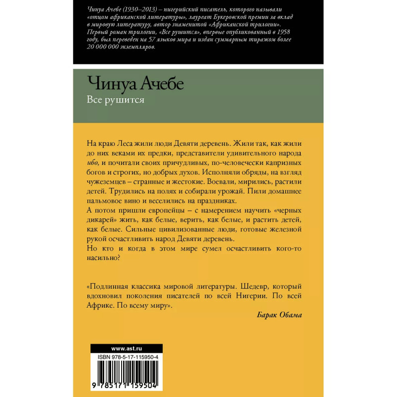 Все рушится. На краю Леса жили люди Девяти деревень. Жили так, как жили до них веками их предки, представители удивительного народа ибо, и почитали своих причудливых, по-человечески капризных богов и строгих, но добрых духов. Исполняли обряды, на взгляд чужеземцев - странные и жестокие. Воевали, мирились, растили детей. Трудились на полях и собирали урожай. Пили домашнее пальмовое вино и веселились на праздниках. А потом пришли европейцы - с намерением научить "черных дикарей" жить, как белые, верить, как белые, и растить детей, как белые. Сильные цивилизованные люди, готовые железной рукой осчастливить народ Девяти деревень. Но кто и когда в этом мире сумел осчастливить кого-то насильно?