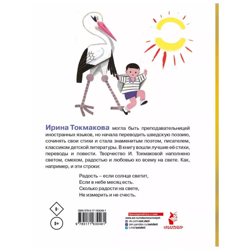 Ирина Токмакова могла быть преподавательницей иностранных языков, но начала переводить шведскую поэзию, сочинять свои стихи и стала знаменитым поэтом, писателем, классиком детской литературы. В книгу вошли лучшие её стихи, переводы и повести. Творчество И. Токмаковой наполнено светом, смехом, радостью и любовью ко всему на свете. Как, например, и эти строки: Радость если солнце светит, Если в небе месяц есть. Сколько радости на свете, Не измерить и не счесть.