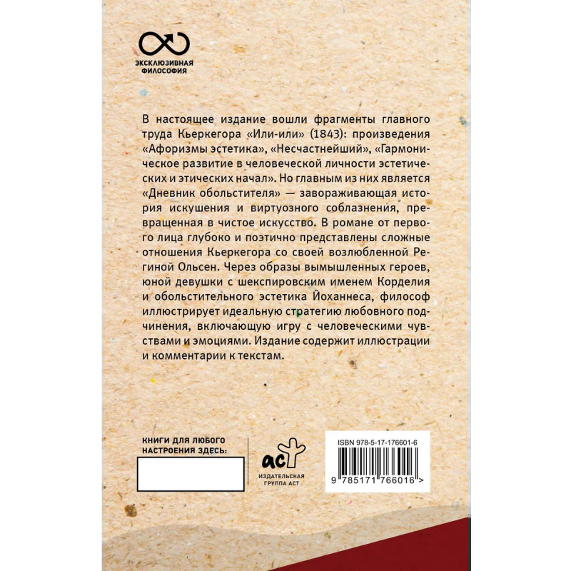 В настоящее издание вошли фрагменты главного труда Кьеркегора "Или-или" (1843): произведения "Афоризмы эстетика", "Несчастнейший", "Гармоническое развитие в человеческой личности эстетических и этических начал". Но главным из них является "Дневник обольстителя" — завораживающая история искушения и виртуозного соблазнения, превращенная в чистое искусство. В романе от первого лица глубоко и поэтично представлены сложные отношения Кьеркегора со своей возлюбленной Региной Ольсен. Через образы вымышленных героев, юной девушки с шекспировским именем Корделия и обольстительного эстетика Йоханнеса, философ иллюстрирует идеальную стратегию любовного подчинения, включающую игру с человеческими чувствами и эмоциями. Издание содержит иллюстрации и комментарии к текстам.