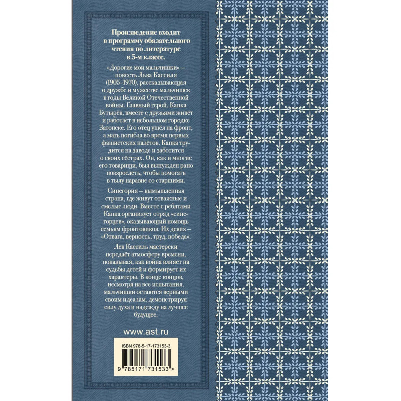 Произведение входит в программу обязательного чтения по литературе в 5-м классе. "Дорогие мои мальчишки" — повесть Льва Кассиля (1905–1970), рассказывающая о дружбе и мужестве мальчишек в годы Великой Отечественной войны. Главный герой, Капка Бутырёв, вместе с друзьями живёт и работает в небольшом городке Затонске. Его отец ушёл на фронт, а мать погибла во время первых фашистских налётов. Капка трудится на заводе и заботится о своих сёстрах. Он, как и многие его товарищи, был вынужден рано повзрослеть, чтобы помогать в тылу наравне со старшими. Синегория — вымышленная страна, где живут отважные и смелые люди. Вместе с ребятами Капка организует отряд "синегорцев", оказывающий помощь семьям фронтовиков. Их девиз — "Отвага, верность, труд, победа". Лев Кассиль мастерски передаёт атмосферу времени, показывая, как война влияет на судьбы детей и формирует их характеры. В конце концов, несмотря на все испытания, мальчишки остаются верными своим идеалам, демонстрируя силу духа и надежду на лучшее будущее.