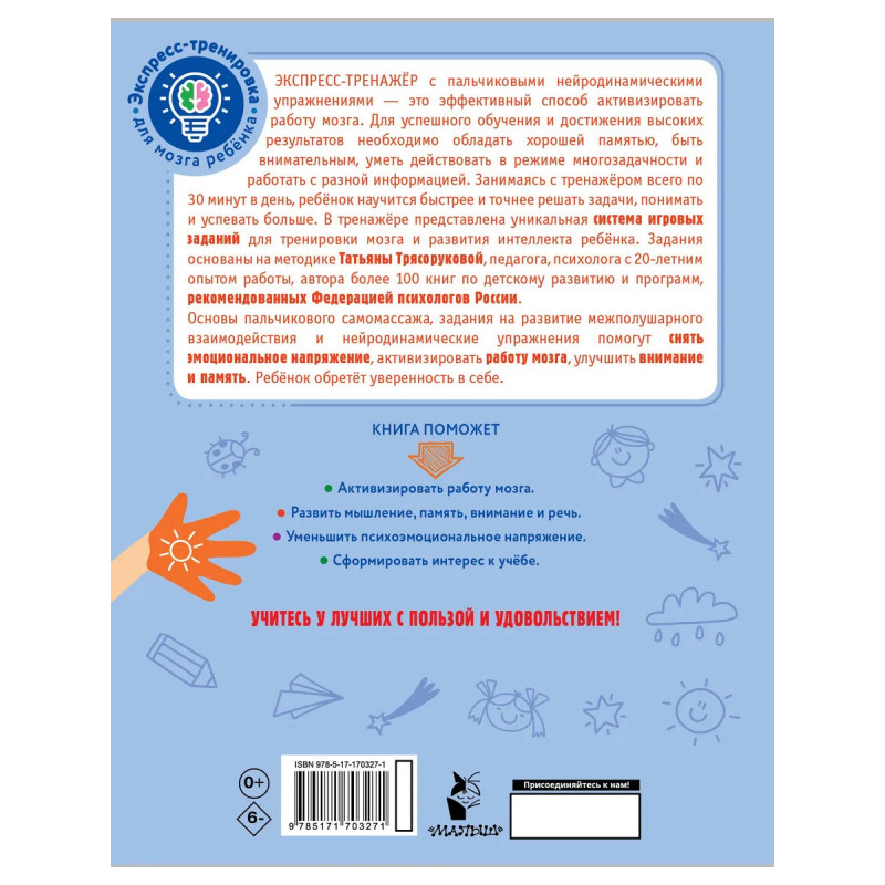 Многие родители сталкиваются с проблемой невнимательности детей на уроках в начальной школе. Только под контролем взрослого ребенок способен сосредоточиться и выполнить задания. В этой книге опытный психолог и педагог, автор развивающих программ и пособий Татьяна Трясорукова предлагает комплекс нейродинамических упражнений, в основе которых лежит пальчиковая гимнастика. Нейропсихологические и логопедические упражнения способствуют концентрации внимания, развитию мелкой моторики рук, улучшают внимание, память и речь, активизируют работу мозга. Тренажер поможет снизить эмоциональную нагрузку школьника, сформирует новые и укрепит уже имеющиеся межполушарные связи. Развивающие задания и веселые картинки сделают занятия не только полезными, но и увлекательными. Книга станет отличным подарком для младших школьников, подойдет на 1 сентября или выпускной детского сада в качестве профилактики школьной дезадаптации. Учитесь с пользой и удовольствием!