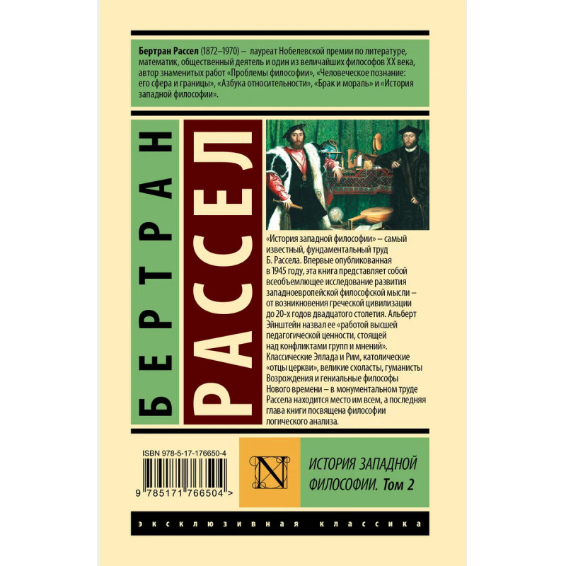 — Бертран Рассел — известный английский философ, математик и общественный деятель, лауреат Нобелевской премии по литературе. — «История западной философии» — самый известный и фундаментальный труд Бертрана Рассела. — Второй том «Истории западной философии» охватывает период от средних веков до первых десятилетий XX века. — Издание в серии «Эксклюзивная классика (Лучшее)» — в узнаваемом оформлении и твердой обложке.