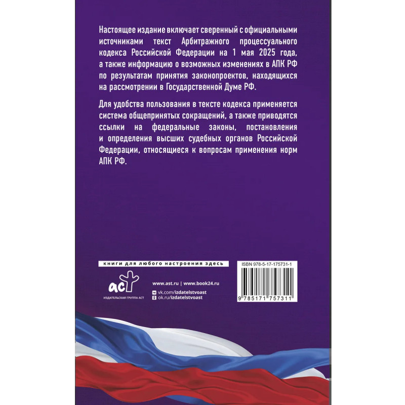 Данное издание Арбитражного процессуального кодекса РФ сверено с официальным источником и приводится по состоянию на 1 мая 2025 года. Кодекс учитывает все изменения, опубликованные в официальных источниках на момент подписания издания в печать. В издании представлена информация о возможных изменениях в АПК РФ по результатам принятия законопроектов, находящихся на рассмотрении в Государственной Думе РФ. Для удобства пользования в тексте кодекса применяется система общепринятых сокращений, а также приводятся ссылки на федеральные законы, постановления Правительства Российской Федерации, постановления и определения высших судебных органов Российской Федерации, относящиеся к вопросам применения норм АПК РФ.