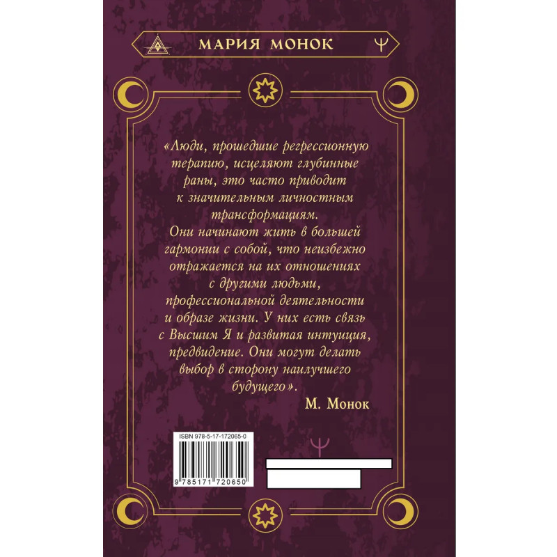 Регрессионная терапия меняет жизнь! Не верите? Тогда прислушайтесь к себе. Было ли у вас чувство, что вы потерялись и не знаете, что делать дальше? Вы словно живете чужой жизнью и все время чувствуете — что-то не так? Большинство людей и не подозревают, что истинная причина их негативных эмоций, страхов и жизненных неудач кроется в прошлой жизни. Это книга о том, как проработать негативный опыт прошлых жизней, чтобы исцелиться от старых травм и обид. Практики регрессотерапии помогут вам найти ваше предназначение, осознать ваши истинные принципы и ценности и отпустить давящий груз прошлого. В удивительных историях погружения в прошлые жизни вы найдете послания для себя, особые инструменты, которые помогут вам не только прожить травматический опыт прошлого, но и обрести гармонию с вашим духовным началом — Высшим Я. С помощью этой книги вы сможете: · проработать ваши глубинные травмы; · узнать, в чем состоит смысл вашей жизни; · улучшить ваше психологическое состояние; · стать счастливее, увереннее и свободнее.