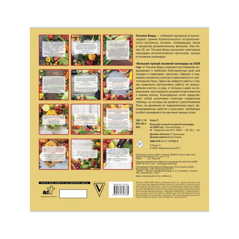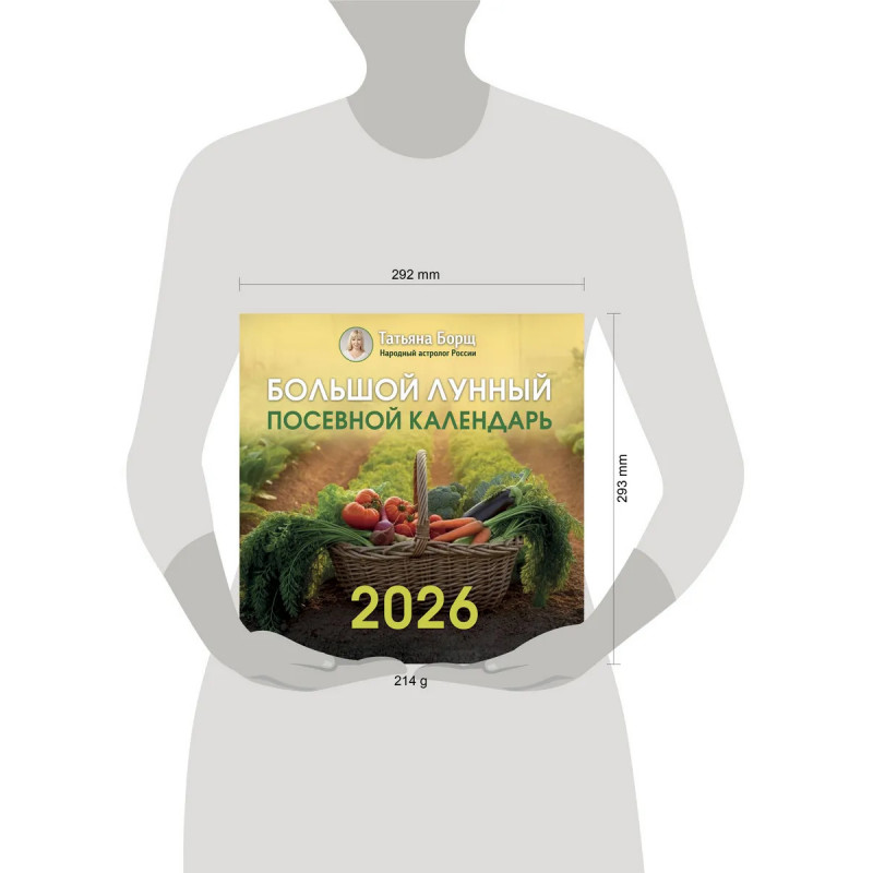 Татьяна Борщ — любимый народный астролог, лауреат премии Копенгагенского астрологического конгресса, историк, телеведущая, автор и продюсер документальных фильмов. Уже более 25 лет Татьяна Борщ выпускает ежегодные календари астрологических прогнозов, лунные и посевные календари. "Большой лунный посевной календарь на 2026 год" от Татьяны Борщ содержит достоверную информацию о наиболее благоприятных днях для посадки и пересадки, прополки, обрезки и подкормки различных культур в зависимости от расположения Луны. Здесь вы найдете советы о том, как правильно организовать работу на приусадебном участке, в саду, в теплице и даже на подоконнике, как сохранить урожай и подготовиться к новому сезону. Календарные сетки представляют собой интуитивно понятные справочные таблицы, из которых вы узнаете о расположении Луны, ее движении по зодиакальному кругу, рекомендованных работах и культурах, требующих особого внимания в те или иные лунные сутки.