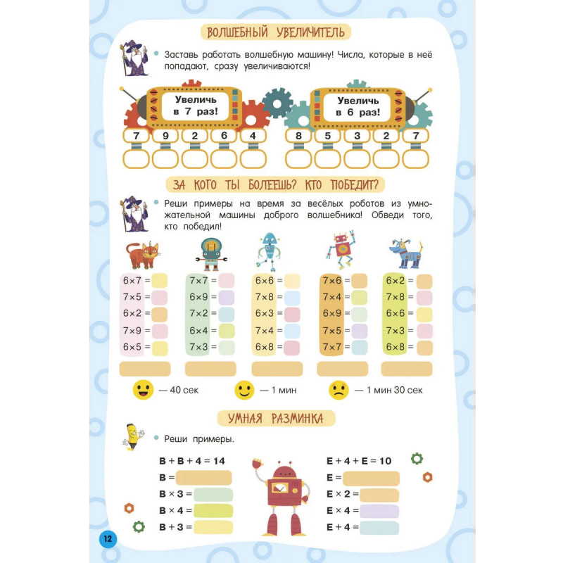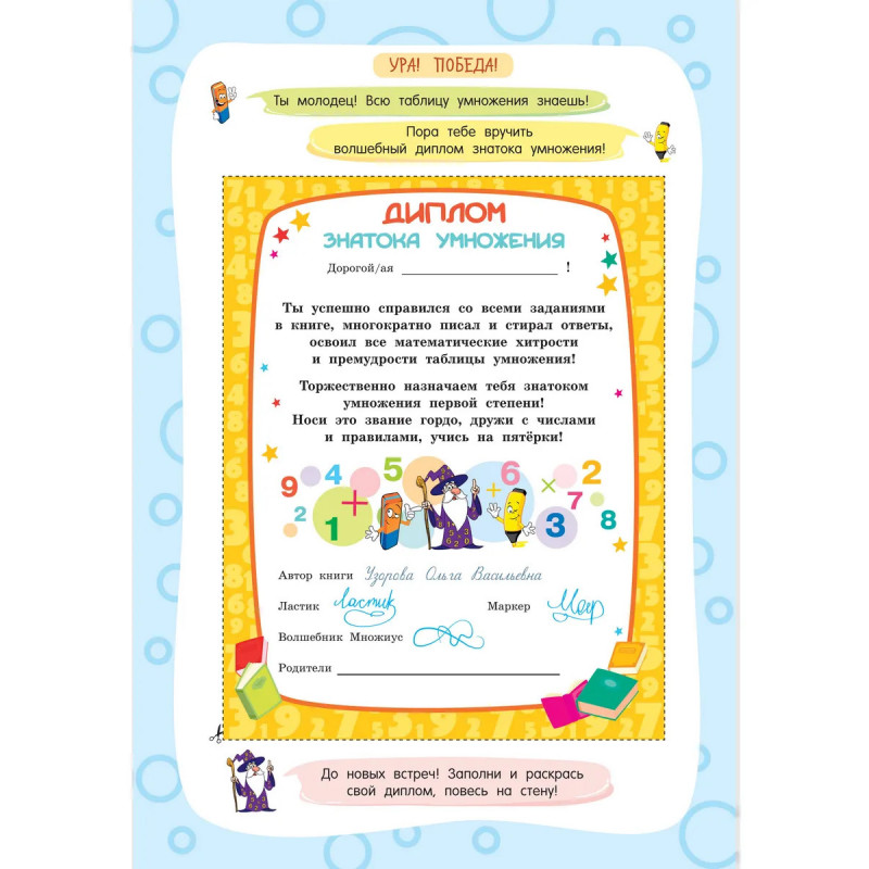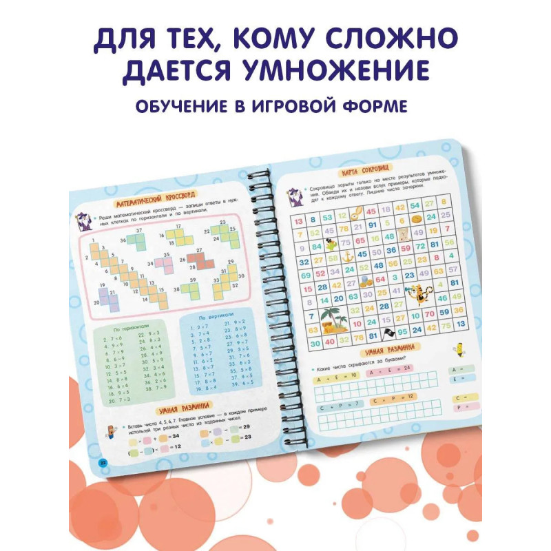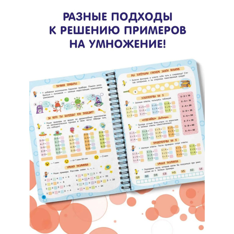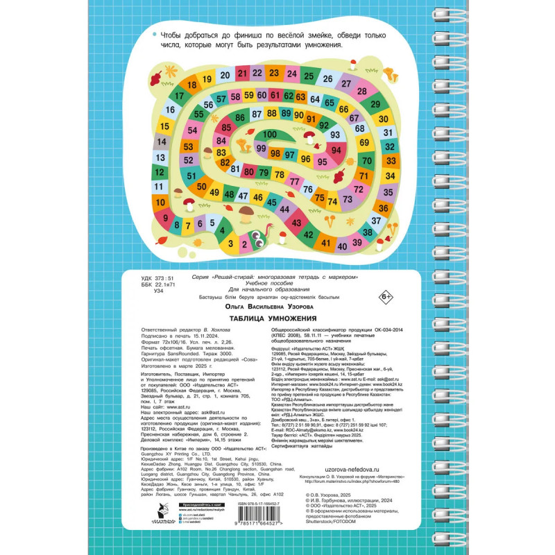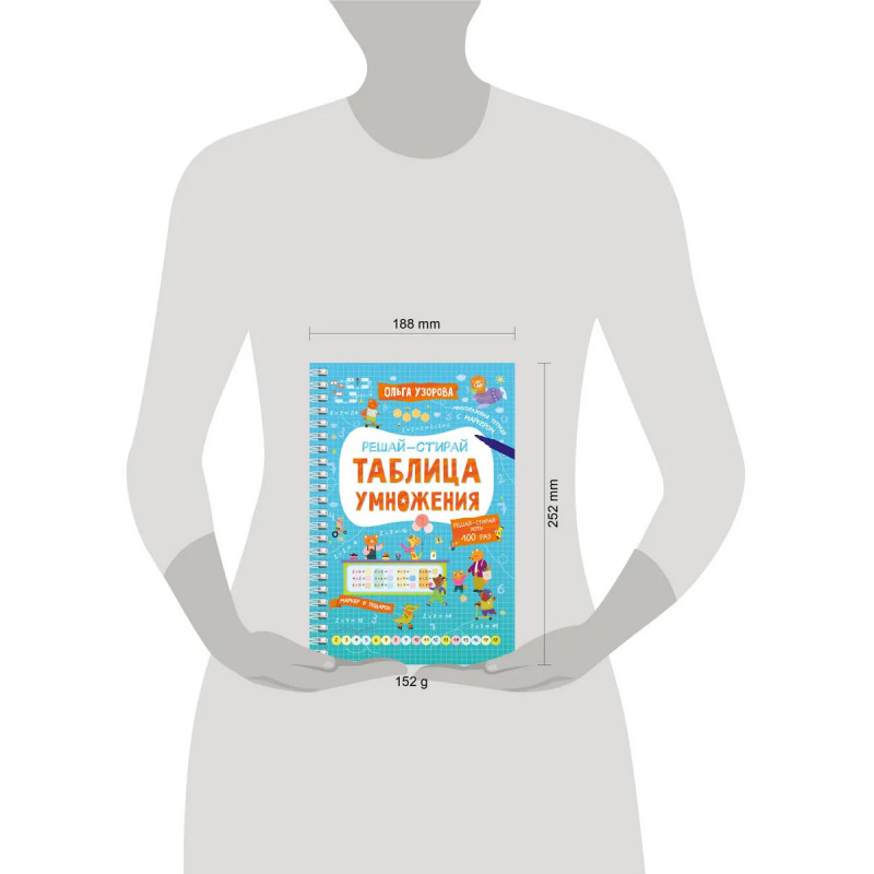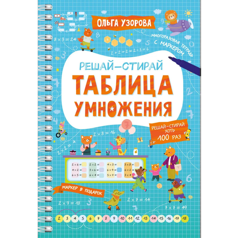 Представляем вашему вниманию удобную многоразовую книгу-тетрадь на спирали «Таблица умножения». Плотная мелованная бумага и ламинированные страницы делают книгу не только привлекательной, но и долговечной. Теперь юный ученик может решать, писать и стирать, исправлять ошибки и снова начинать с чистого листа благодаря специальному маркеру, который идеально подходит для письма на глянцевых страницах. Маркер на водной основе входит в комплект. Ваш ребёнок в весёлой компании волшебника Множиуса быстро и максимально эффективно выучит таблицу умножения, повысит успеваемость в школе. Автор методики — педагог-практик с 30-летним стажем О. В. Узорова. Суммарный тираж книг автора к 2024 году составил более 60 миллионов экземпляров. Подарите вашему ребёнку возможность с лёгкостью и радостью получать необходимые знания и полезные навыки!
