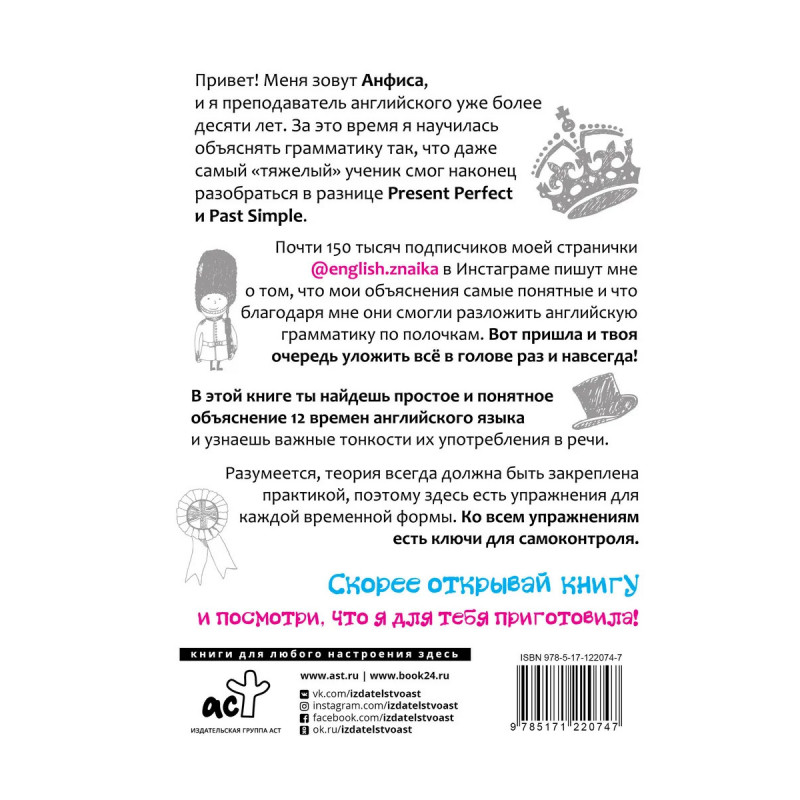 Привет! Меня зовут Анфиса, и я преподаватель английского уже более десяти лет. За это время я научилась объяснять грамматику так, что даже самый "тяжелый" ученик смог наконец разобраться в разнице Present Perfect и Past Simple. Почти 150 тысяч подписчиков моей странички @english.znaika пишут мне о том, что мои объяснения самые понятные и что благодаря мне они смогли разложить английскую грамматику по полочкам. Вот пришла и твоя очередь уложить всё в голове раз и навсегда! В этой книге ты найдешь простое и понятное объяснение 12 времен английского языка и узнаешь важные тонкости их употребления в речи. Разумеется, теория всегда должна быть закреплена практикой, поэтому здесь есть упражнения для каждой временной формы. Ко всем упражнениям есть ключи для самоконтроля. Скорее открывай книгу и посмотри, что я для тебя приготовила!