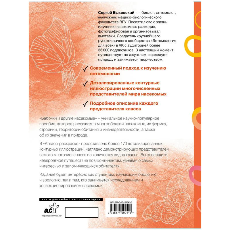 Сергей Быковский – биолог, энтомолог, выпускник медико-биологического факультета ВГУ. Посвятил свою жизнь изучению насекомых: разводил, фотографировал и организовывал выставки. Создатель крупнейшего русскоязычного сообщества "Энтомология для всех" в VK с аудиторией более 33 000 подписчиков. В настоящий момент путешествует по джунглям, исследует природу и занимается творчеством. - Современный подход к изучению энтомологии; - Детализированные контурные иллюстрации многочисленных представителей мира насекомых; - Подробное описание каждого представителя класса. "Бабочки и другие насекомые" – уникальное научно-популярное пособие, которое расскажет о многообразии насекомых, их формах, строении, территории обитания и жизнедеятельности, а также об их значении в природе. В "Атласе-раскраске" представлено более 170 детализированных контурных иллюстраций, наглядно демонстрирующих представителей самого многочисленного по количеству видов класса.