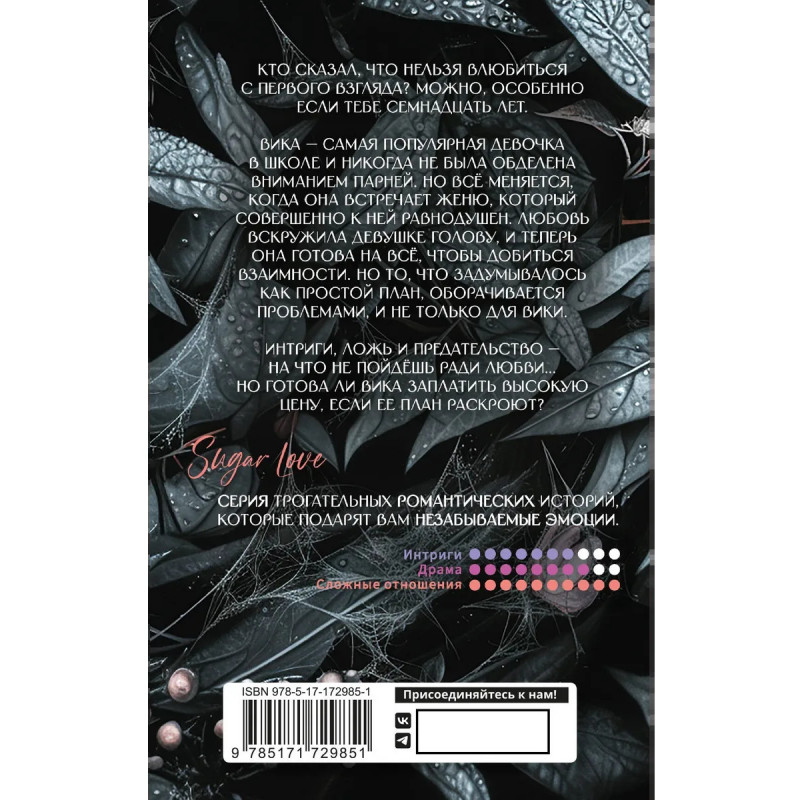 Кто сказал, что нельзя влюбиться с первого взгляда? Можно, особенно если тебе семнадцать лет. Вика — самая популярная девочка в школе и никогда не была обделена вниманием парней. Но все меняется, когда она встречает Женю, который совершенно к ней равнодушен. Любовь вскружила девушке голову, и теперь она готова на все, чтобы добиться взаимности. Но то, что задумывалось как простой план, оборачивается проблемами, и не только для Вики. Интриги, ложь и предательство — на что не пойдешь ради любви... Но готова ли Вика заплатить высокую цену, если ее план раскроют?