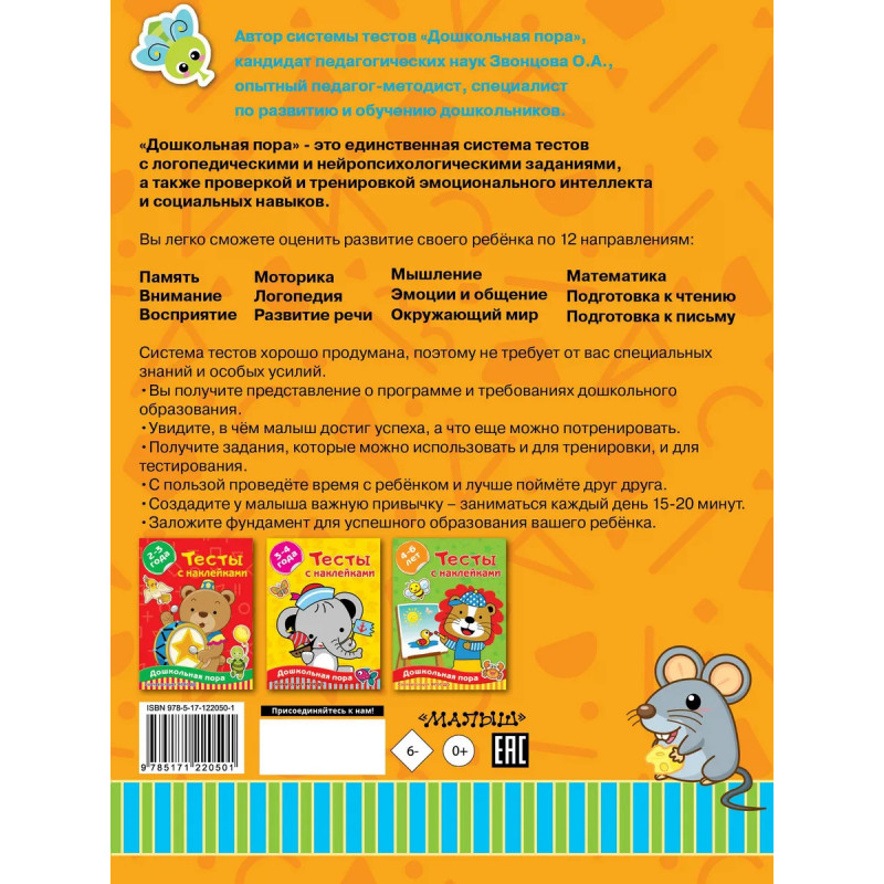 "Дошкольная пора" - система тестов, по которой любой родитель может проверить, что его ребёнку хорошо удаётся, а над чем ещё можно поработать. Автор книг-тестов – кандидат педагогических наук Звонцова О.А., опытный педагог и специалист по развивающему обучению. В этой системе проверки знаний, увлекательные вопросы и творческие задания объединены с логопедическими и нейропсихологическими упражнениями, а также проверкой и тренировкой эмоционального интеллекта и социальных навыков. Наклейки увлекают и мотивируют ребёнка к занятиям. В конце книги есть специальный сертификат, который можно подписать и вручить ребёнку, как официальную награду за хорошо проделанную работу. Для дошкольного возраста.