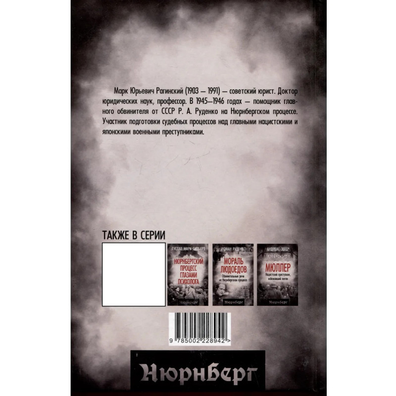 Автор книги, М. Ю. Рагинский в качестве помощник главного обвинителя от СССР Р. А. Руденко, участвовал в подготовки и проведении Международного военного трибунала. На основе личных воспоминаний, а так же документов из советских и западных архивов, автор рассказывает о малоизвестных подробностях Нюренбергского процесса. Благодаря своему служебному положению автор был посвящен в подробности, которые не были доступны участвующим в этом судебном процессе советским журналистам. Написанная в последние годы существования СССР она не содержит официоза эпохи холодной войны.