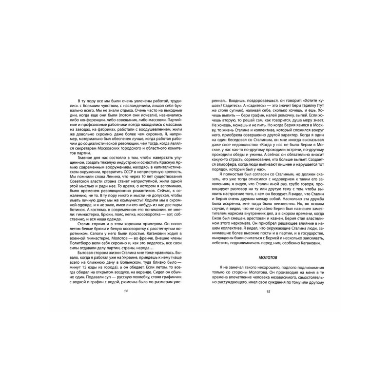 Авторы книги Н.С. Хрущев, А.И. Микоян, Л.М. Каганович занимали высшие посты в руководстве СССР и хорошо знали «второго человека после Сталина» – В.М. Молотова. Вячеслав Михайлович Молотов был Председателем Совета народных комиссаров СССР в 1930–1941 годах, народным комиссаром иностранных дел СССР в 1939–1949 годах. Он известен прежде всего как создатель «пакта Молотова – Риббентропа» накануне войны с Германией, однако роль Молотова в жизни Советского Союза при Сталине была намного больше, чем участие во внешней политике. В воспоминаниях Хрущева, Микояна и Кагановича приводятся свидетельства и факты на этот счет, – что же касается личности Молотова, то у каждого из авторов есть свое мнение о нем.