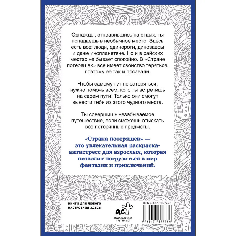 Однажды, отправившись на отдых, ты попадаешь в необычное место. Здесь есть все: люди, единороги, динозавры и даже инопланетяне. Но и в райских местах не бывает спокойно. В "Стране потеряшек" все имеет свойство теряться, поэтому ее так и прозвали. Чтобы самому тут не затеряться, нужно помочь всем, кого ты встретишь на своем пути! Только они смогут вывести тебя из этого чудного места. Ты совершишь незабываемое путешествие, если сможешь отыскать все потерянные предметы. "Страна потеряшек" это увлекательная раскраска-антистресс для взрослых, которая позволит погрузиться в мир фантазии и приключений.
