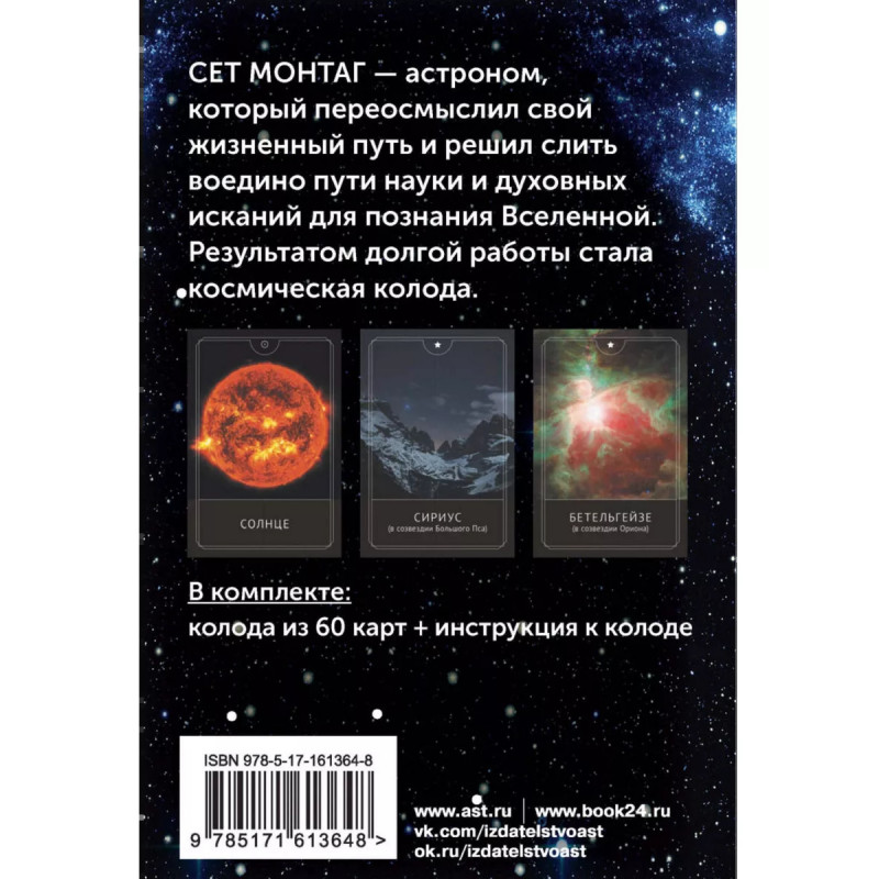Таро Космоса. Энергии Вселенной для предсказания будущего и выбора правильного решения. Сет Монтаг, бывший астроном, а ныне духовный практик, создал колоду карт, используя изображения космических объектов. Через энергии реальных участников космического движения человек может приблизиться к познанию законов Вселенной и получить информацию о будущем. Вам откроются знаки Вселенной. Карты подойдут для толкования прошлого и планирования будущего, помогут определиться с выбором личного пути. Снимки космических аппаратов и цифровые картины транслируют энергию Космоса, открывая информационный портал. Так вы сможете получить Знание, которое поможет жить лучше. Настройтесь на мелодию Вселенной с помощью "энергетических камертонов". В комплекте: колода из 60 карт + инструкция к колоде.