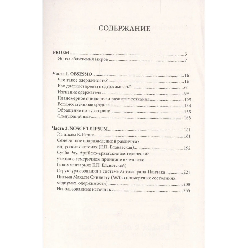 Цель этой книги - изучить разновидности одержимости, научиться определять присутствие (или отсутствие) чужеродных сущностей в человеке, а также найти методы избавления от них. Одновременно преследовалась и другая цель - показать, что наличие деструктивных сил не должно стать препятствием для духовного роста. Зная, что и как омрачает сознание, можно найти и то, что его очищает, возвышает и утончает. В этом плане исследование одержимости скорее будет промежуточным звеном, пройдя которое, люди откроют для себя новые горизонты развития. Книга рассчитана на широкий круг читателей, и написана так, чтобы создать логичную схему и дать общее определение одержимости в простой форме, доступной для понимания обычного человека, и в то же время удовлетворяющей своей полнотой специалистов, которые изучают философию, психологию, и в особенности медицинских работников.