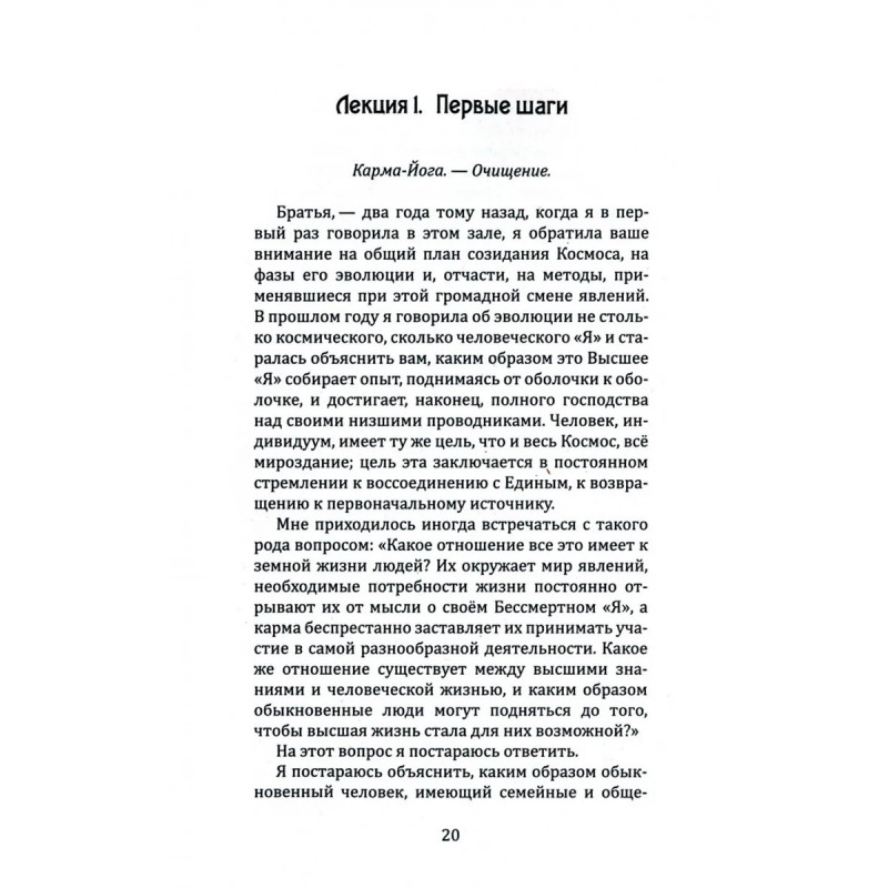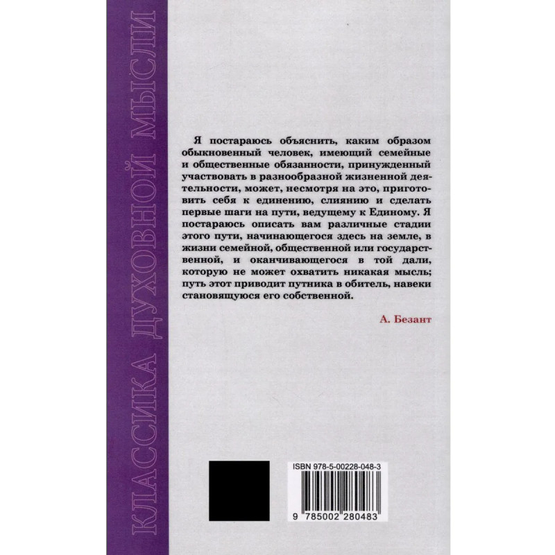 В книге "Пусть ученичества" Анни Безант (1847-1933) - талантливая писательница, президент Теософского Общества, ученица и последовательница Е. П. Блаватской рассказывает о длительном и трудном пути восхождения учеников к духовным вершинам. Она повествует о Карма-йоге, об очищении души и тела, о контроле над мыслями, о медитации, об испытаниях и посвящениях. А также о методах науки будущего и о возможных направлениях и тенденциях развития человеческой цивилизации.Автор говорит читателю: "Я постараюсь объяснить, каким образом обыкновенный человек, имеющий семейные и общественные обязанности, принужденный участвовать в разнообразной жизненной деятельности, может, несмотря на это, приготовить себя к единению, слиянию и сделать первые шаги на пути, ведущему к Единому".Настоящее издание предназначено для всех тех, кто идёт путём духовного развития.