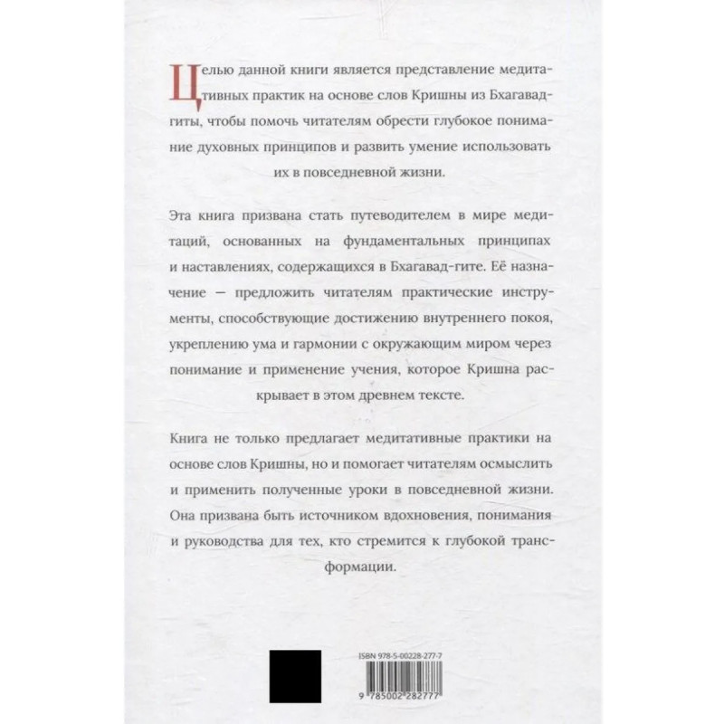 Эта книга содержит более 300 медитативных практик, основанных на словах Кришны. Она приглашает вас на путешествие в мир внутреннего спокойствия и мудрости. Слова Кришны станут вашим проводником в мир медитации, вдохновляя на преображение жизни и на глубокое понимание себя и окружающего мира. Эта книга - ключ к практике осознанности, сострадания и духовного развития, помогающая открыть новые грани внутреннего покоя и гармонии.